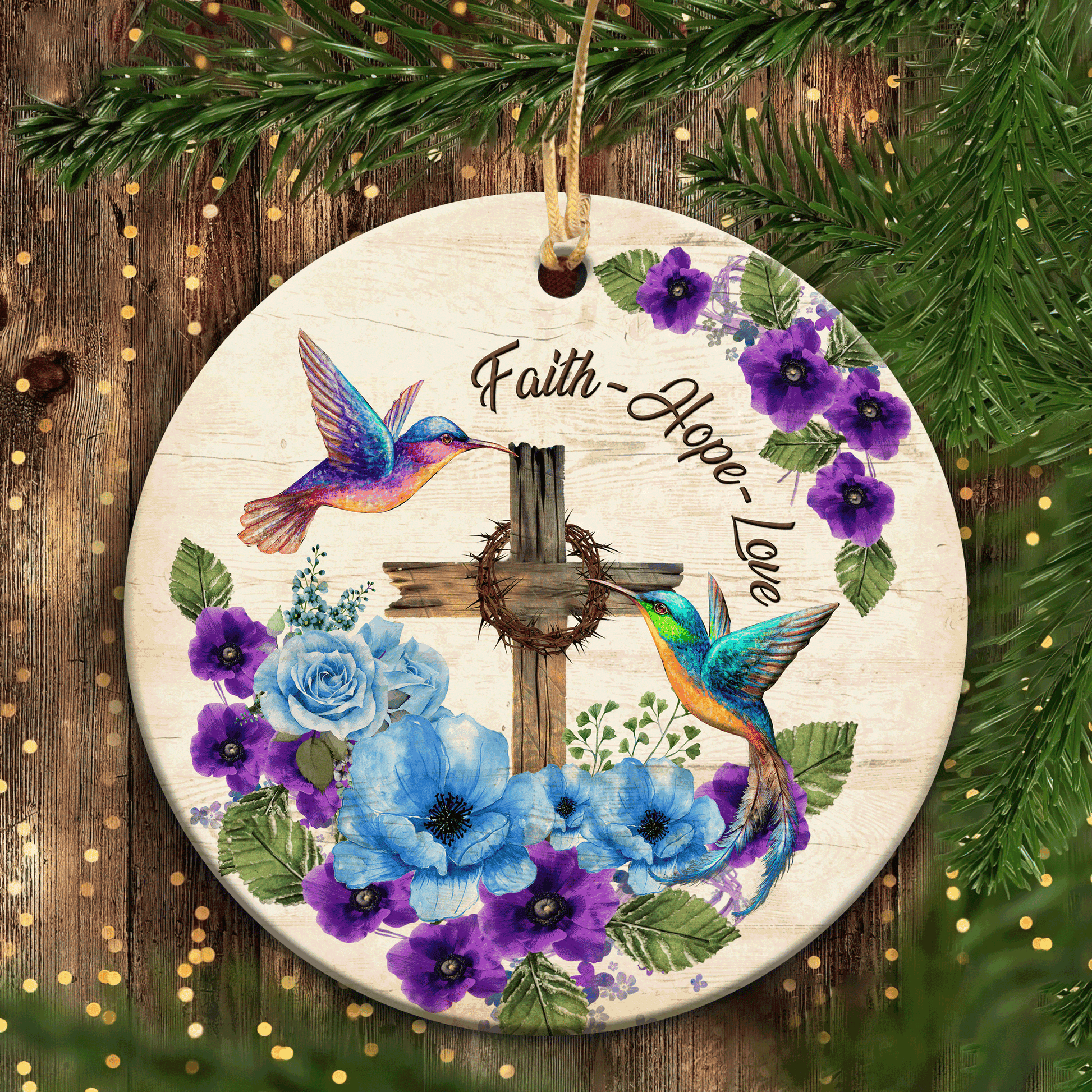 Jesus And Hummingbird - Circle Ceramic Ornament - Hummingbird And The Wooden Cross, Faith Love Hope - Gift For Religious Christian