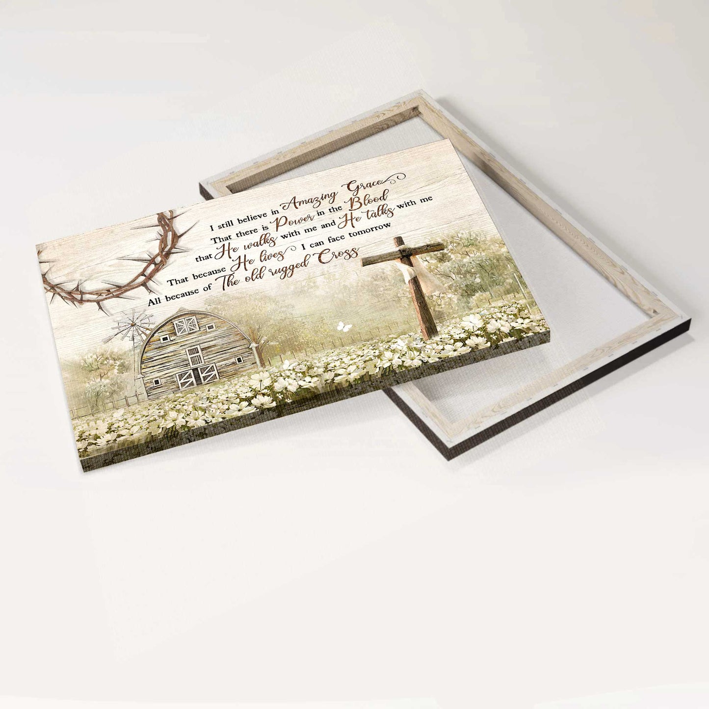 Jesus Landscape Canvas - White flower field, Cross symbol, Vintage house, I still believe in amazing grace Canvas
