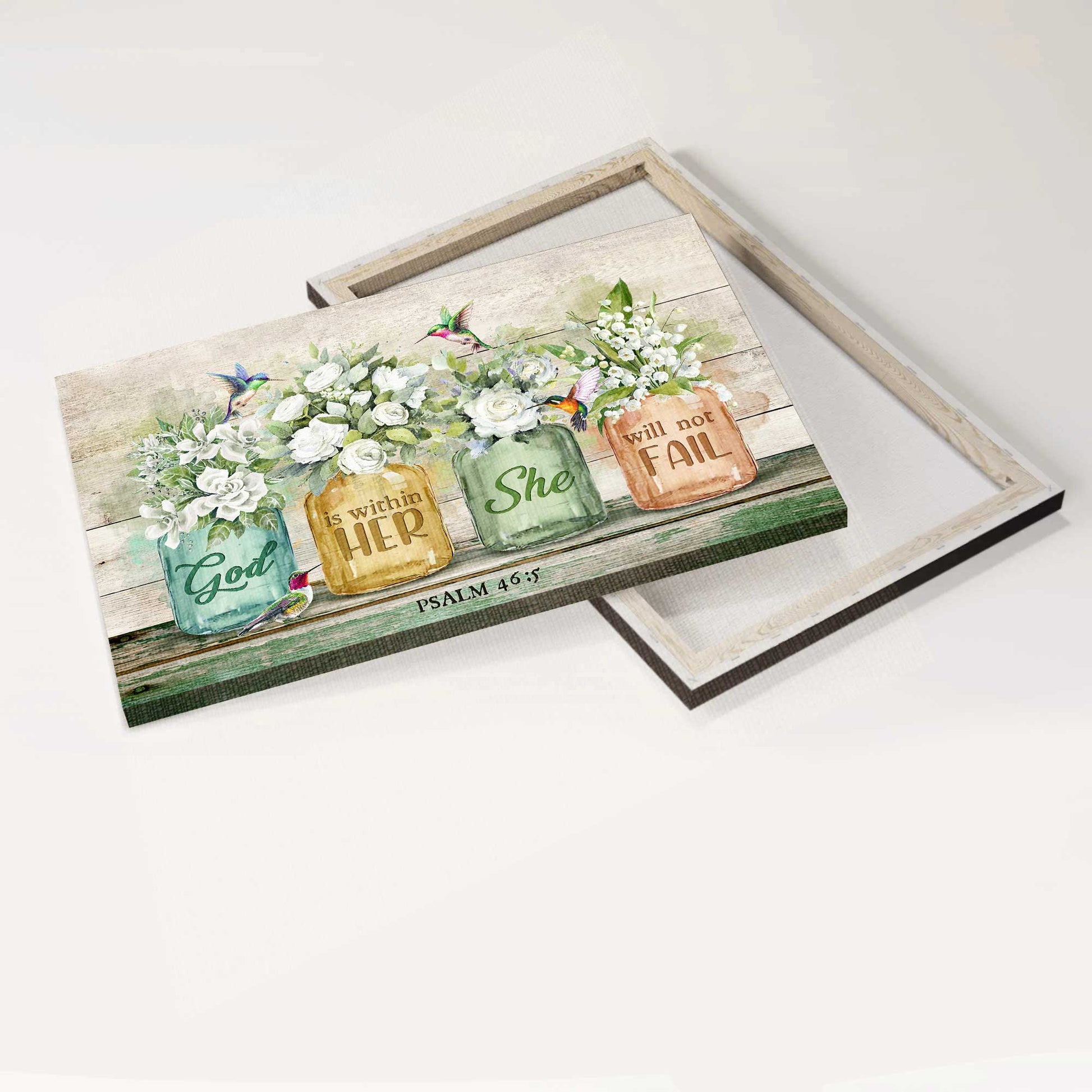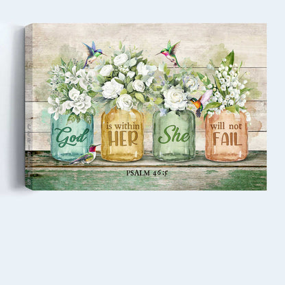 Jesus Landscape Canvas- Amazing Hummingbird, Gorgeous Flower Jar, White Flower Landscape Canvas- Gift For Christian- God Is Within Her, She Will Not Fail.