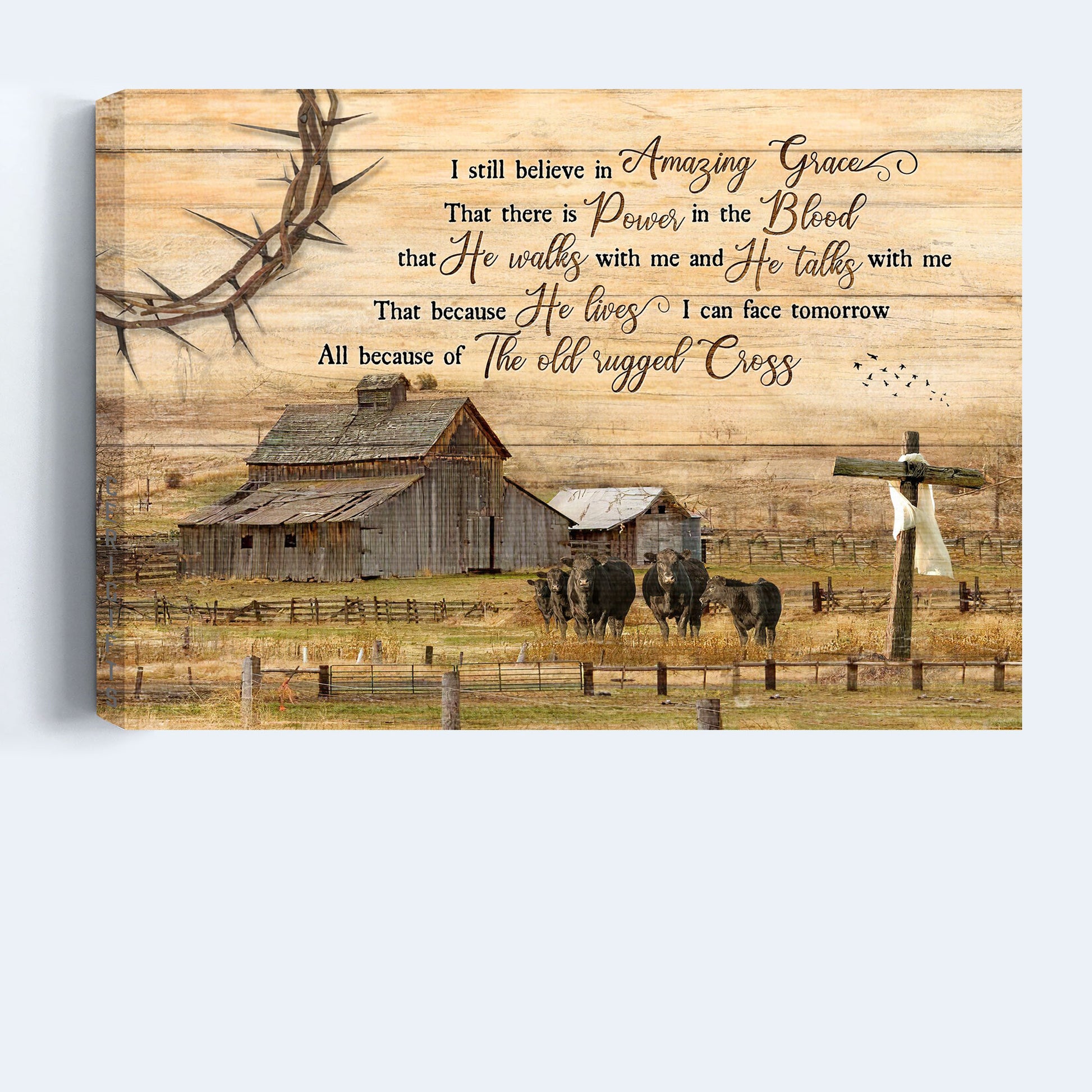 Angus cows, Tranquil farm, Wooden Cross, I still believe in amazing grace - Jesus Landscape Canvas Prints, Wall Artsuits any room in your house from kitchen, bedroom, bathroom to living room.