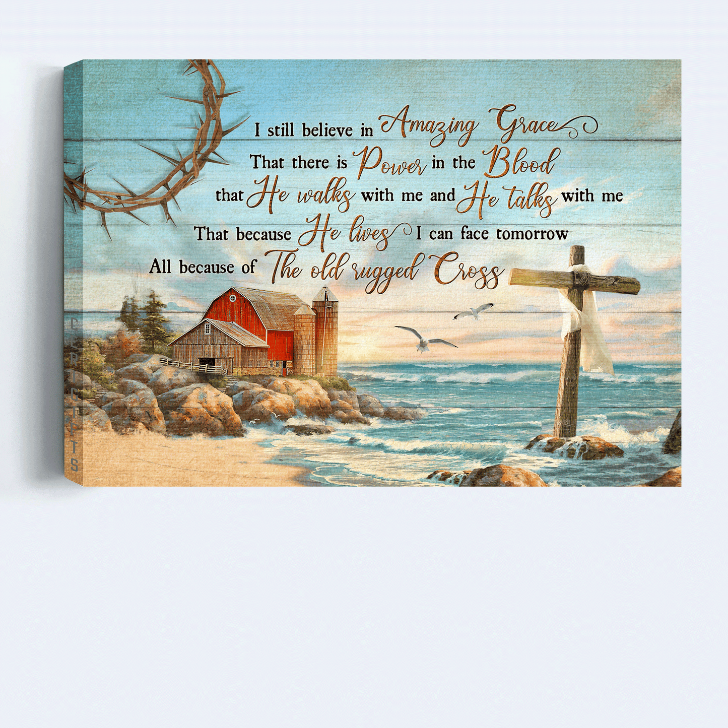 Jesus Landscape Canvas- Beach Painting, Blue Ocean, Rustic Farmhouse- Gift For Christian- I Still Believe In Amazing Grace