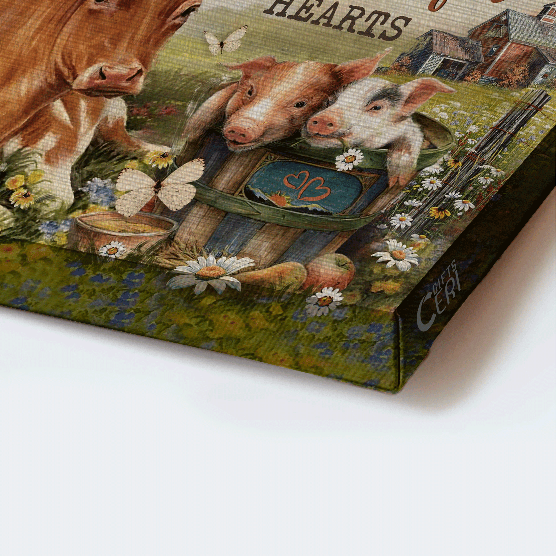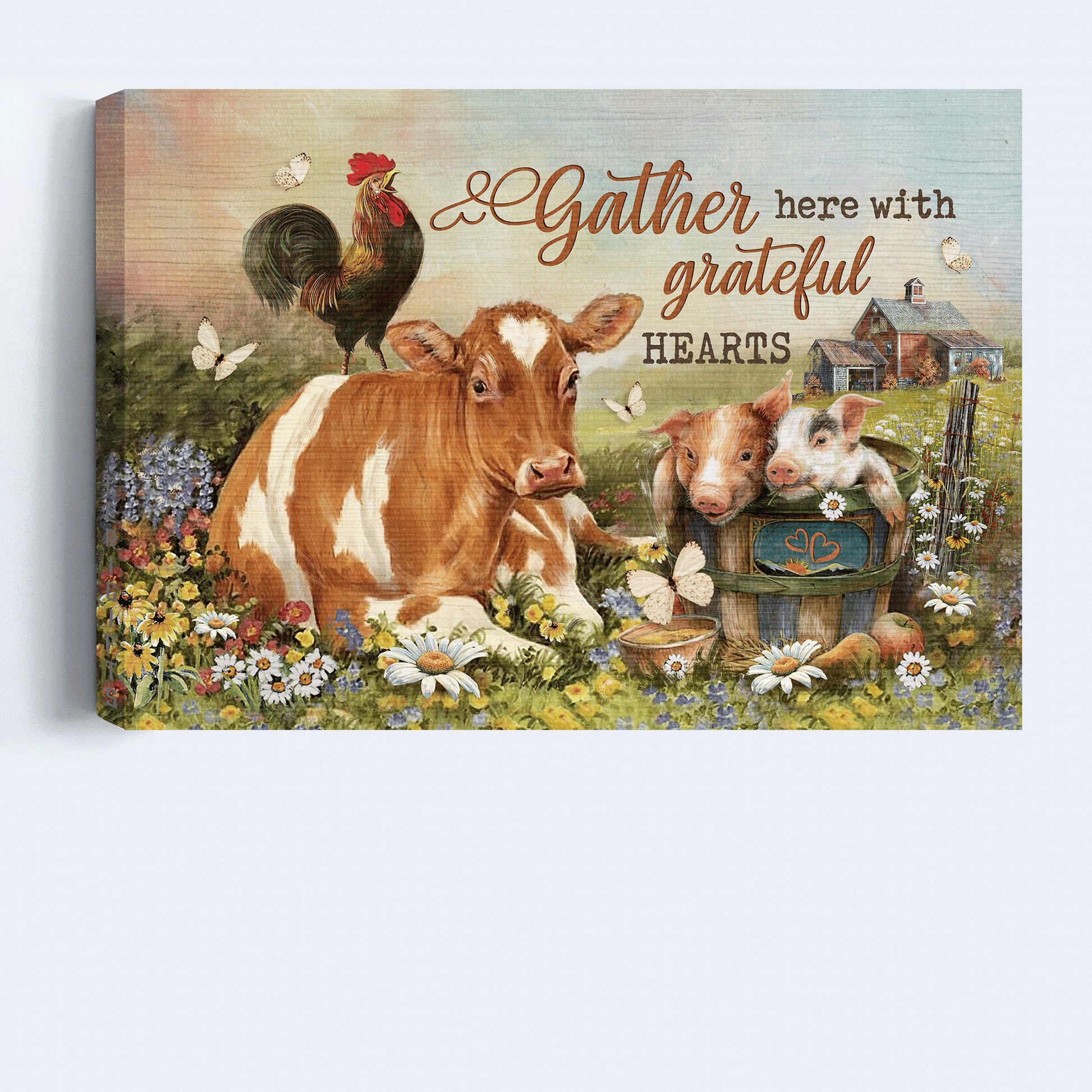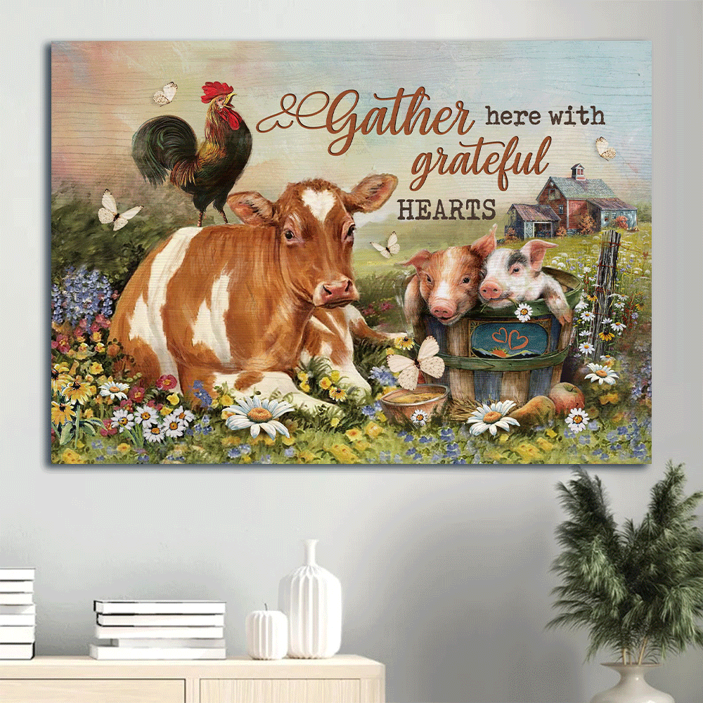 The vintage farm animals with a rooster, a cute baby pig, daisy field and meaningful quote will make you feel full of joy and serve as a comforting presence in your home. Beautiful animals, Farm painting, Gather here with grateful hearts - Jesus Landscape Canvas Prints, Christian Wall Art is the best gift not only for your friend but also for your lover.