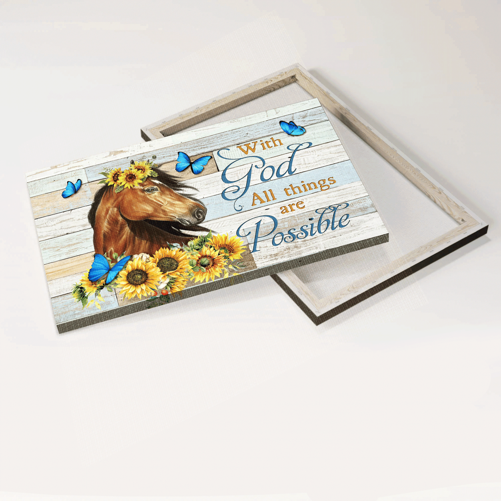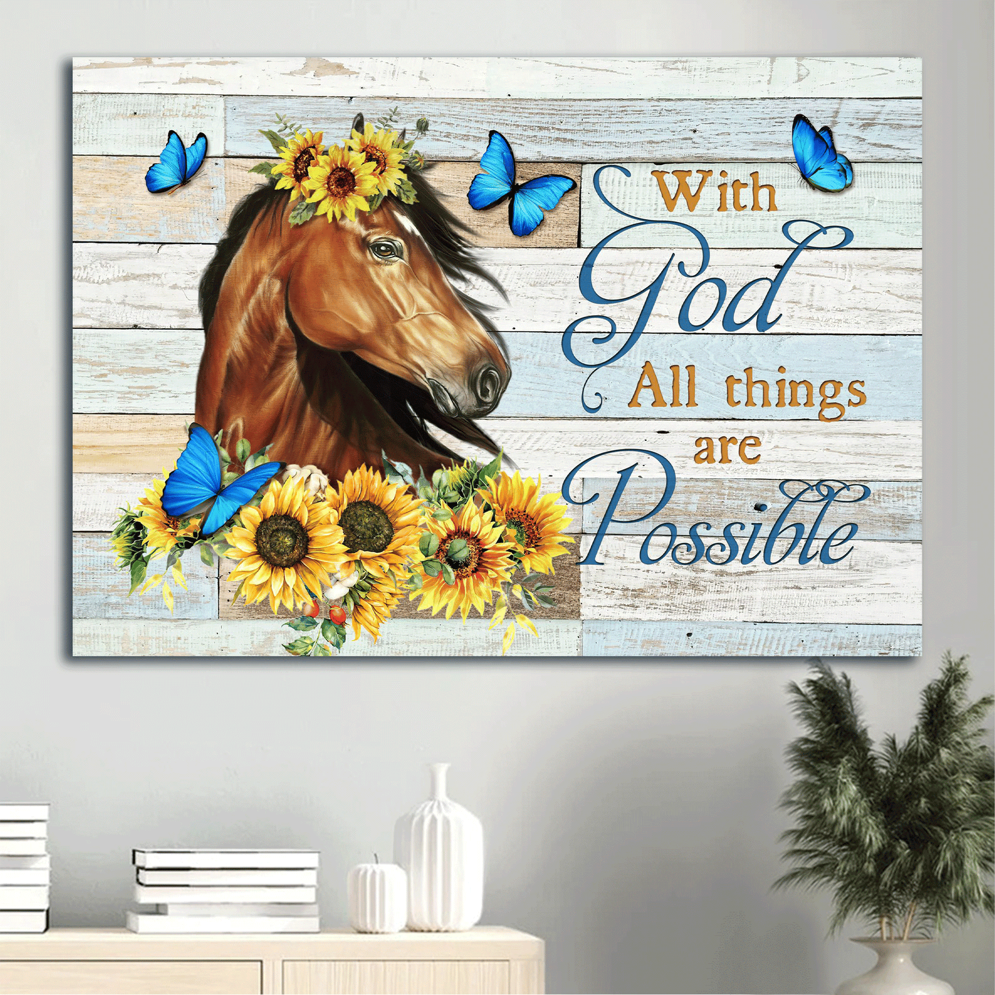 Jesus Landscape Canvas- Beautiful horse painting, Sunflower drawing, Blue butterfly canvas- Gift for Christian- With God all things are possible
