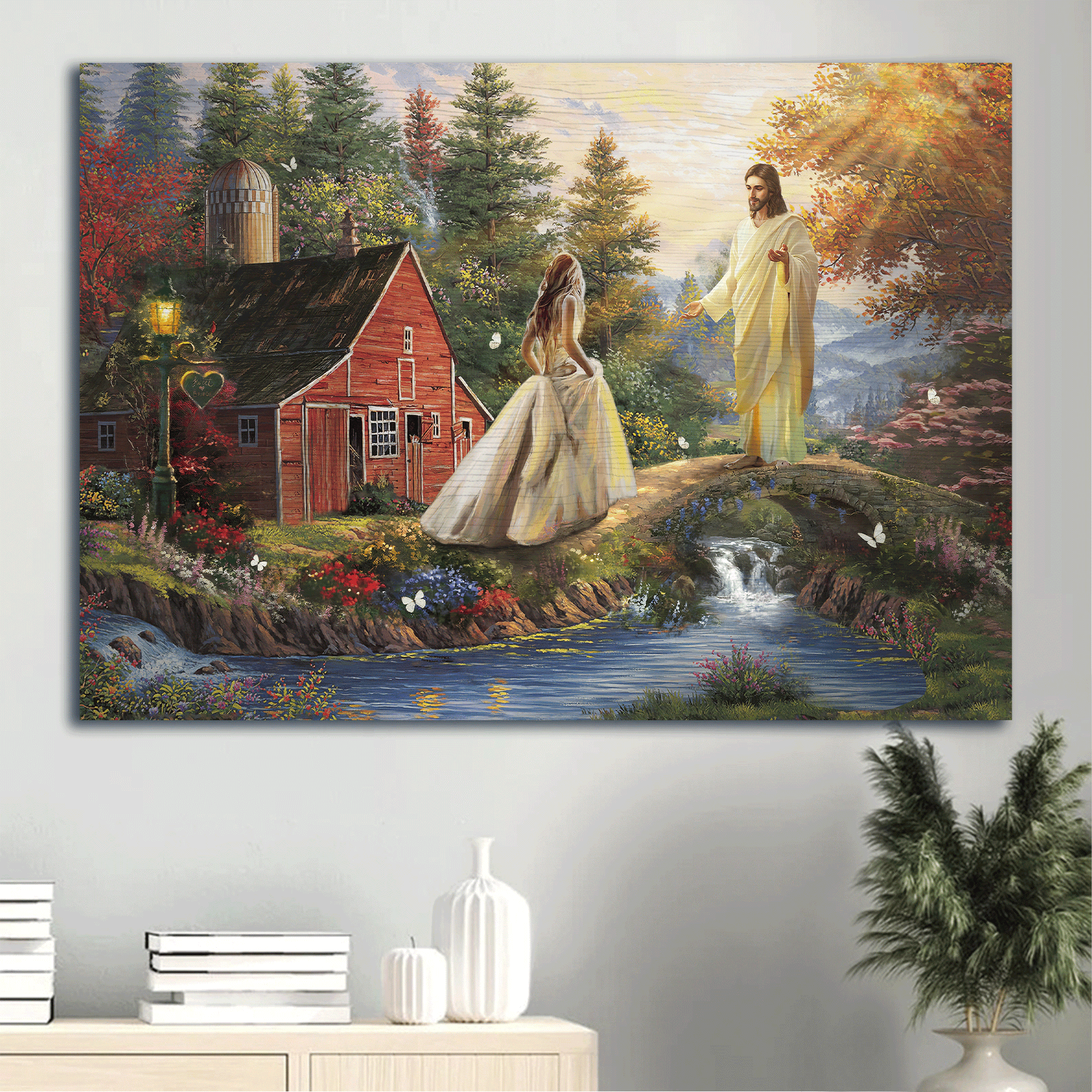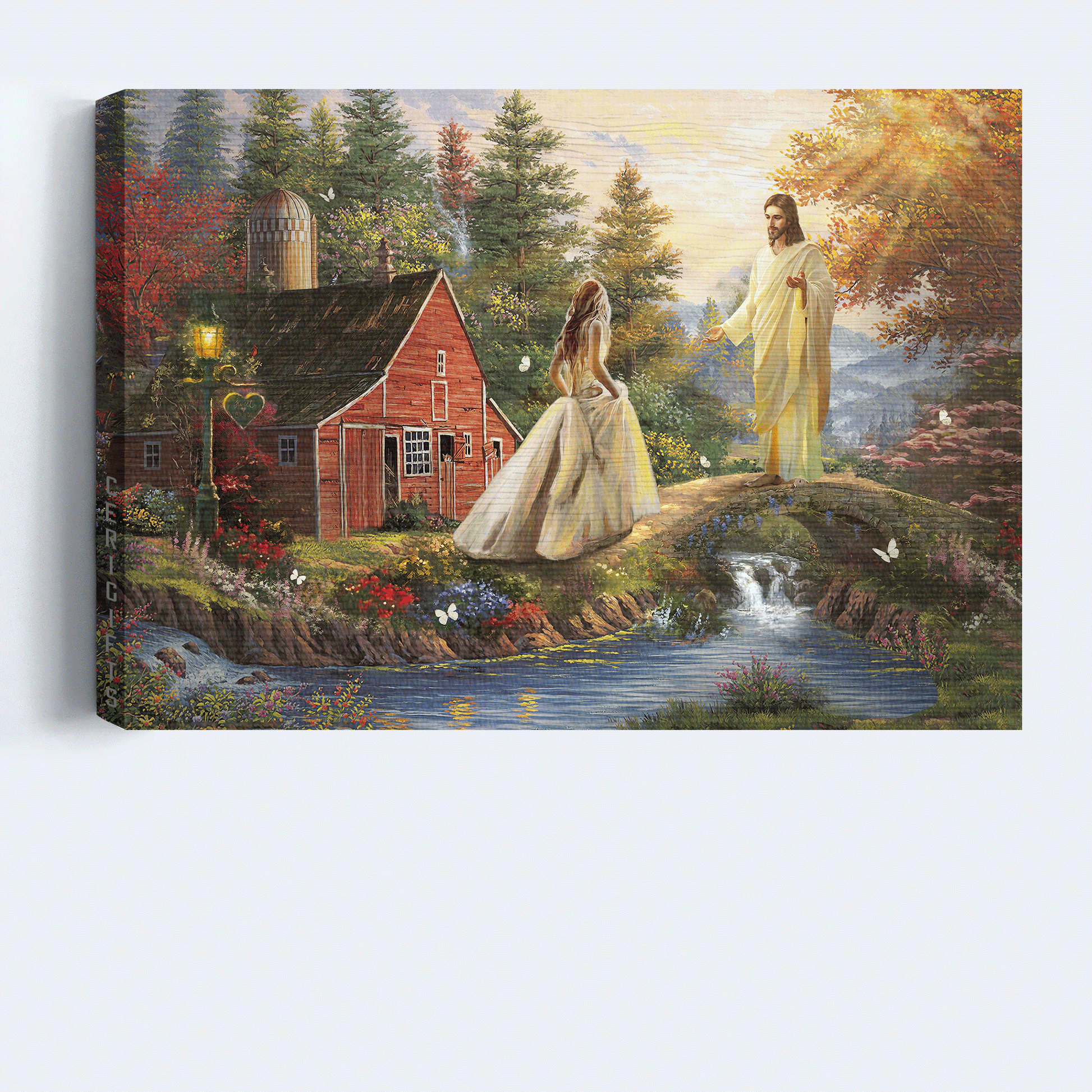 Jesus Landscape Canvas - Beautiful scenery, Wonderful forest, Little red house, Come into his arms Landscape Canvas - Gift For Christian