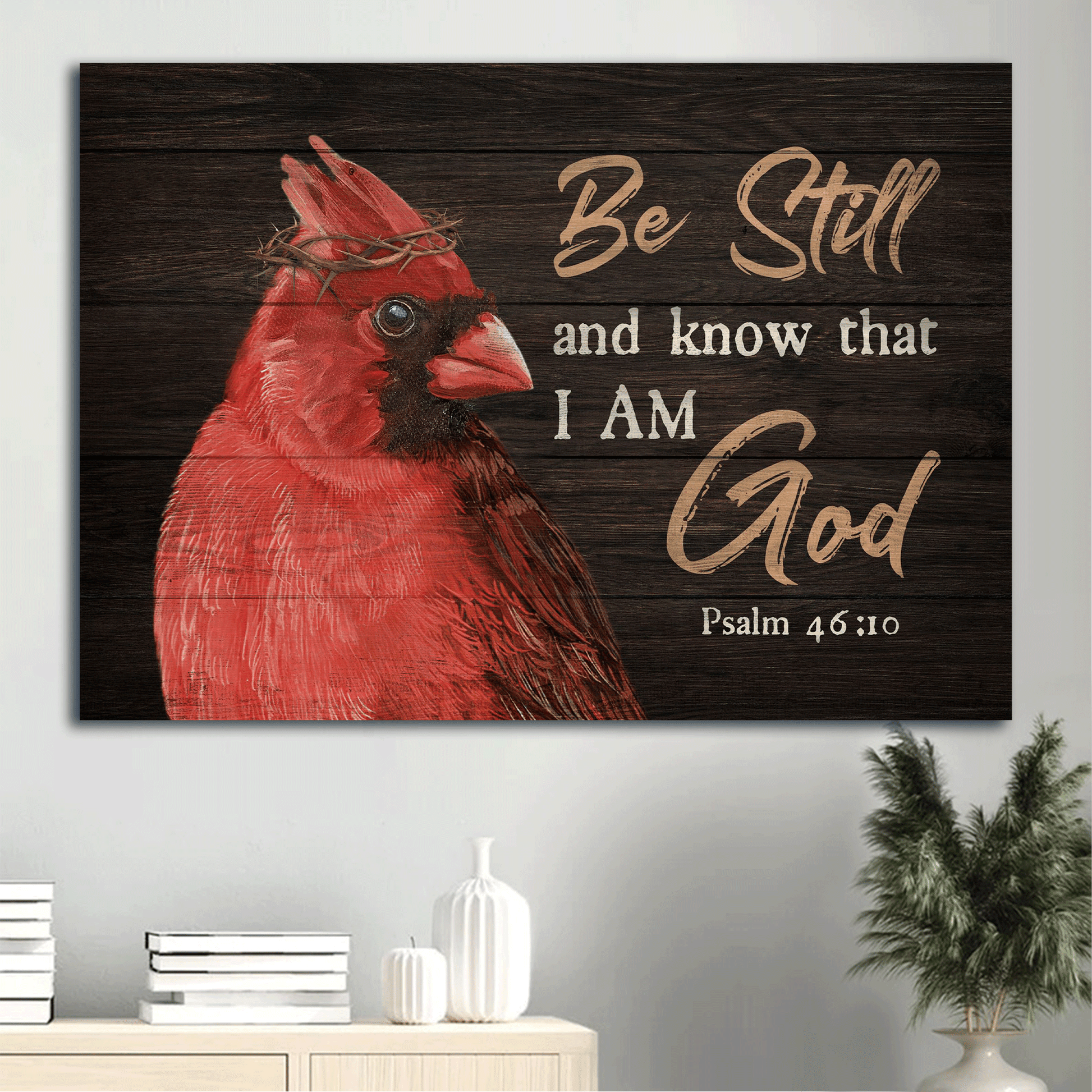 Perfect Wall Decoration: Big Cardinal Psalm 46:10 Landscape Canvas, Christian Wall Art - Crown Of Thorn, Be Still And Know That I Am God is wall decor hang in office, living room, bedroom, this bible modern artwork design perfect matches any space and any home decor style.