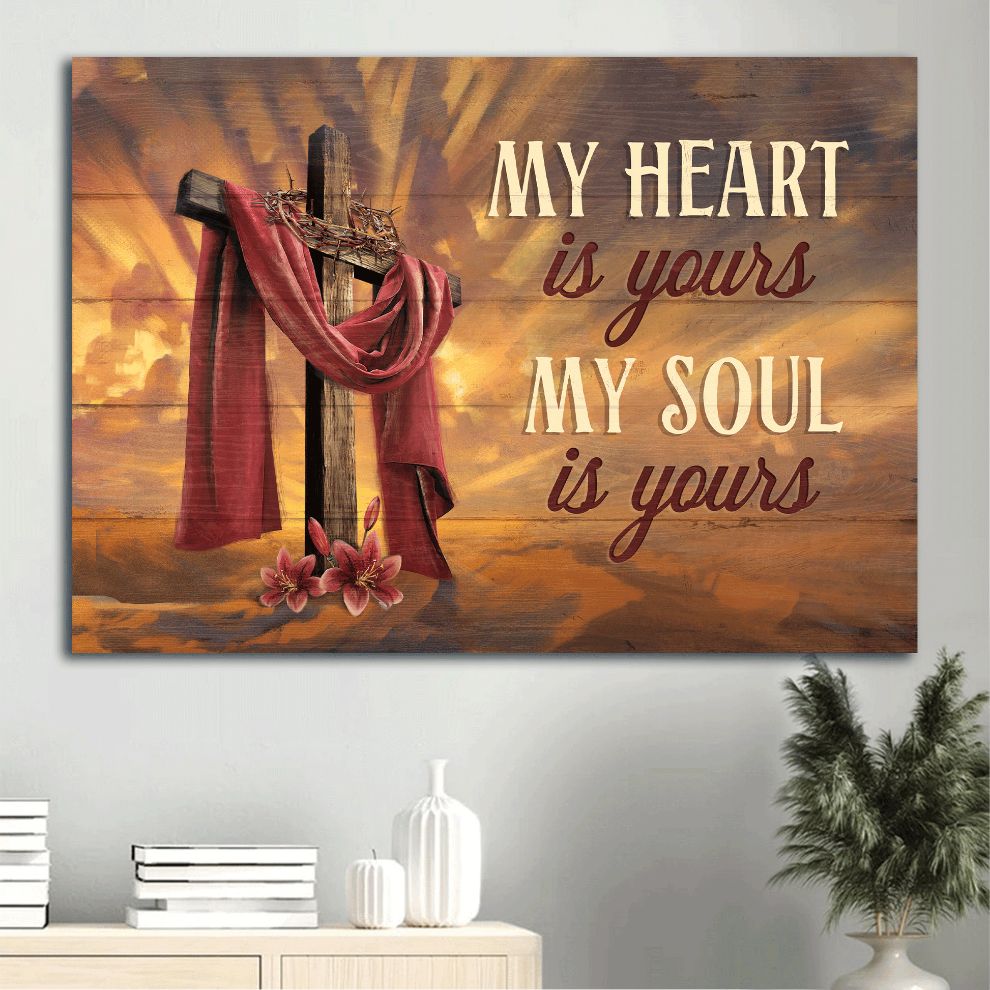 Big cross Crown of thorn Red lily flower Landscape Canvas Wall Art Decor Home with the quote "My heart is yours, My soul is yours" can be displayed on the wall of your home's living room, kitchen, bedroom, bathroom, or outdoor space. They can also be hung on the walls of your office, building, hotel, restaurant, or even coffee shop.