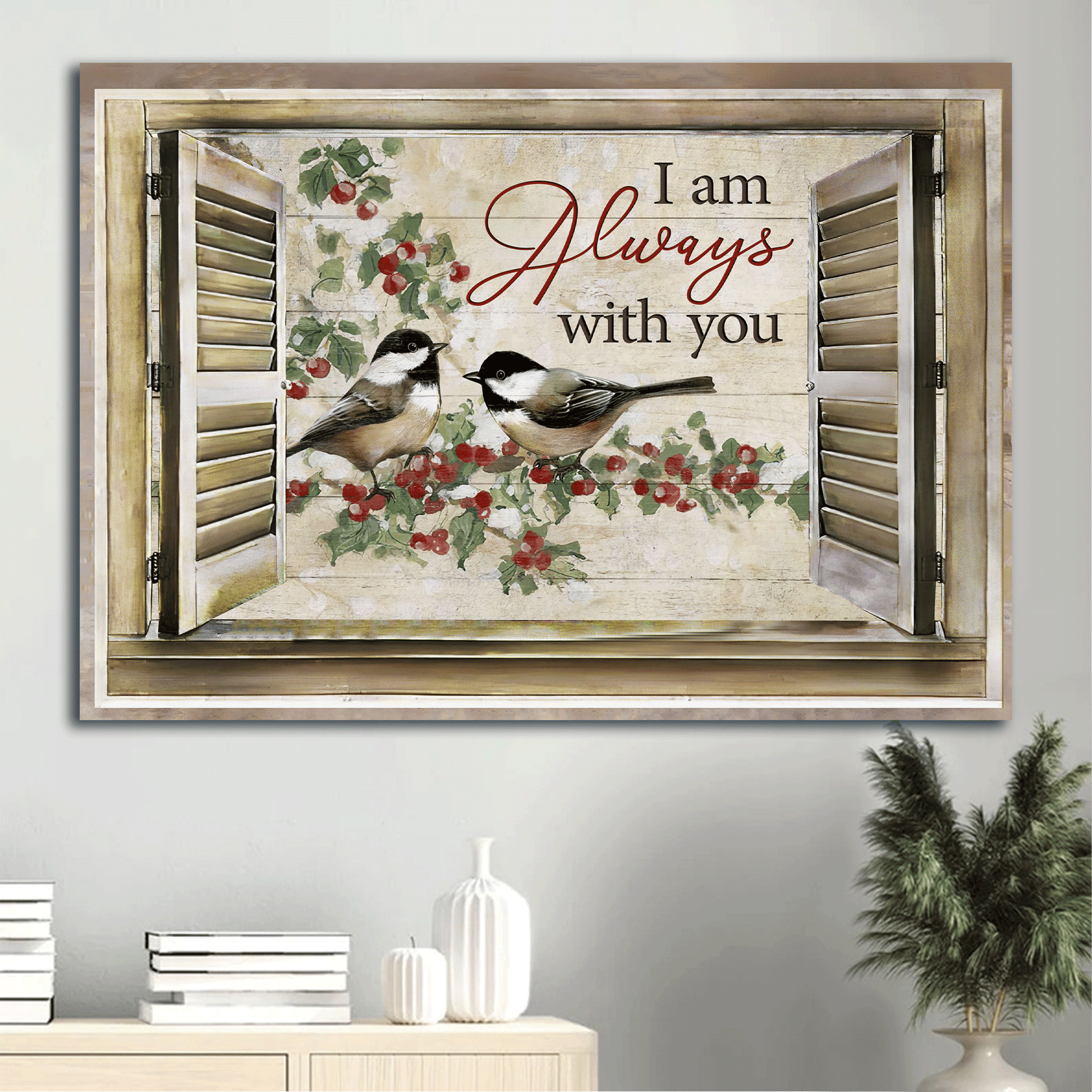 Jesus Landscape Canvas -Bird couple, Tit bird, Wooden windows, Inspirational quote Landscape Canvas - Gift For Christian - I am always with you Landscape Canvas