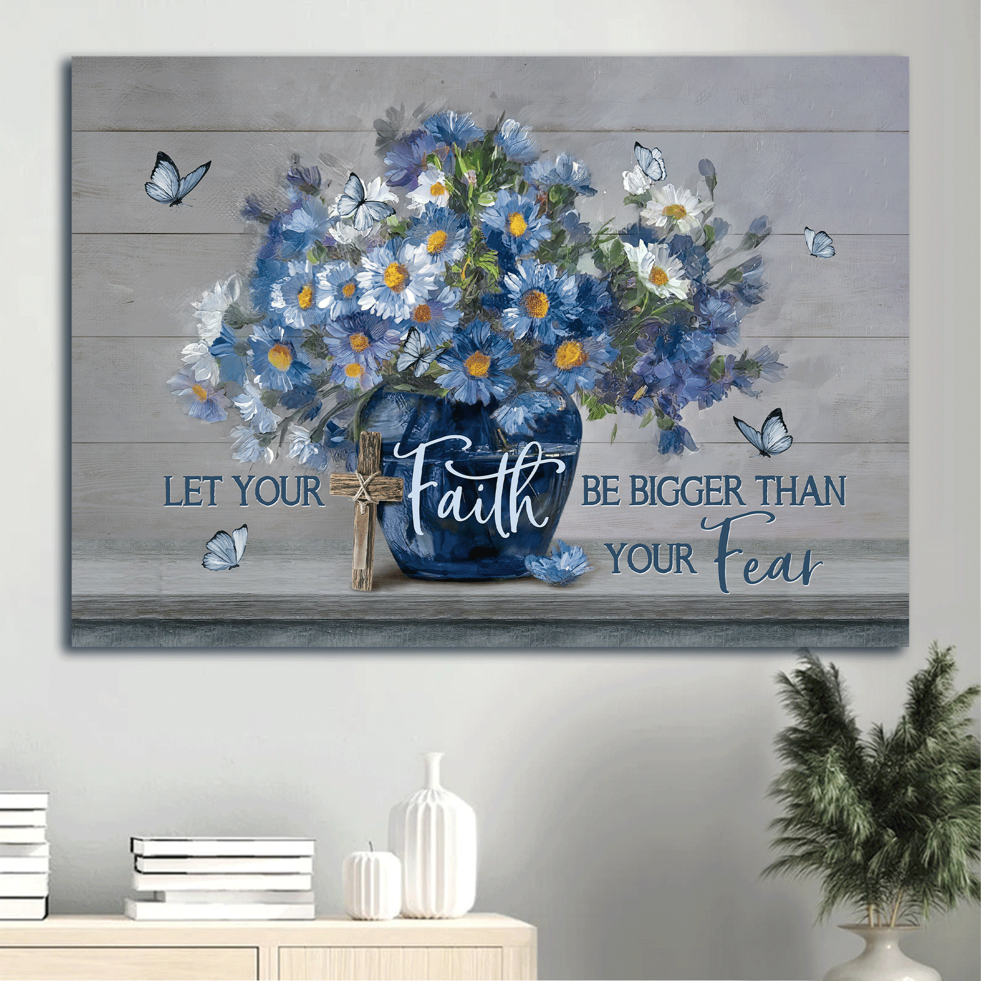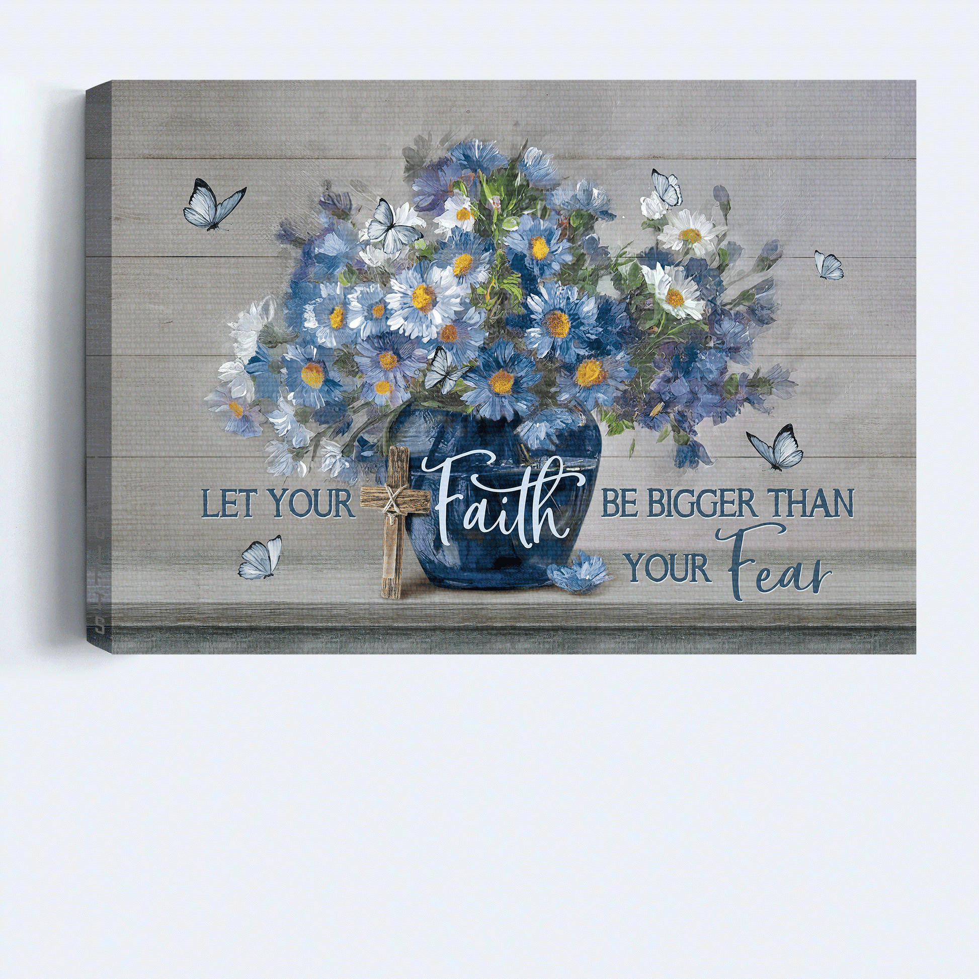 Blue flower Unique butterfly Landscape Canvas Wall Art Decor Home with the quote "Let your faith be bigger than your fear" can be displayed on the wall of your home's living room, kitchen, bedroom, bathroom, or outdoor space. They can also be hung on the walls of your office, building, hotel, restaurant, or even coffee shop.