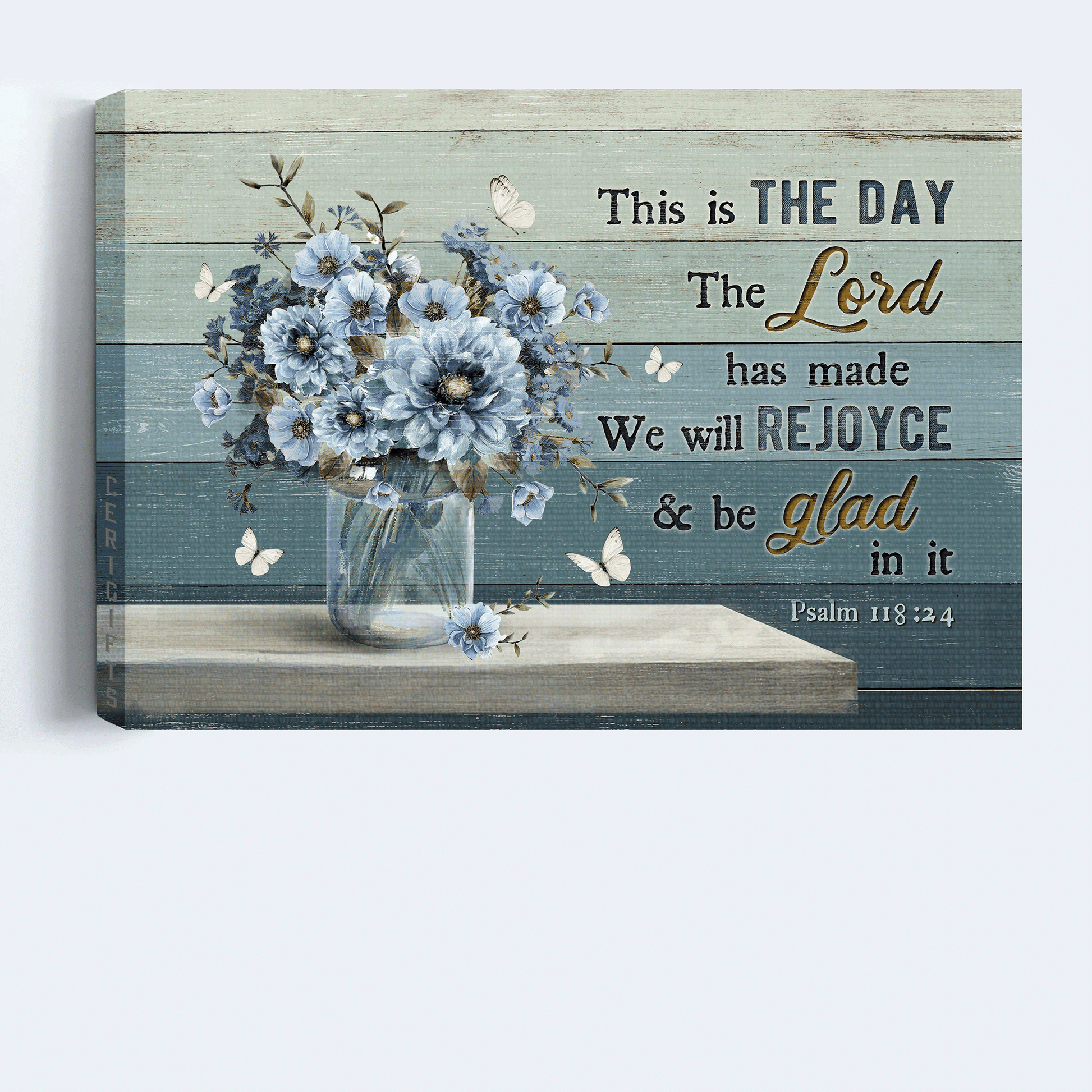 Blue flower Vintage painting Bible verse Landscape Canvas Wall Art Decor Home with the quote "This is the day the Lord has made We will rejoice and be glad in it" can be displayed on the wall of your home's living room, kitchen, bedroom, bathroom, or outdoor space. They can also be hung on the walls of your office, building, hotel, restaurant, or even coffee shop.