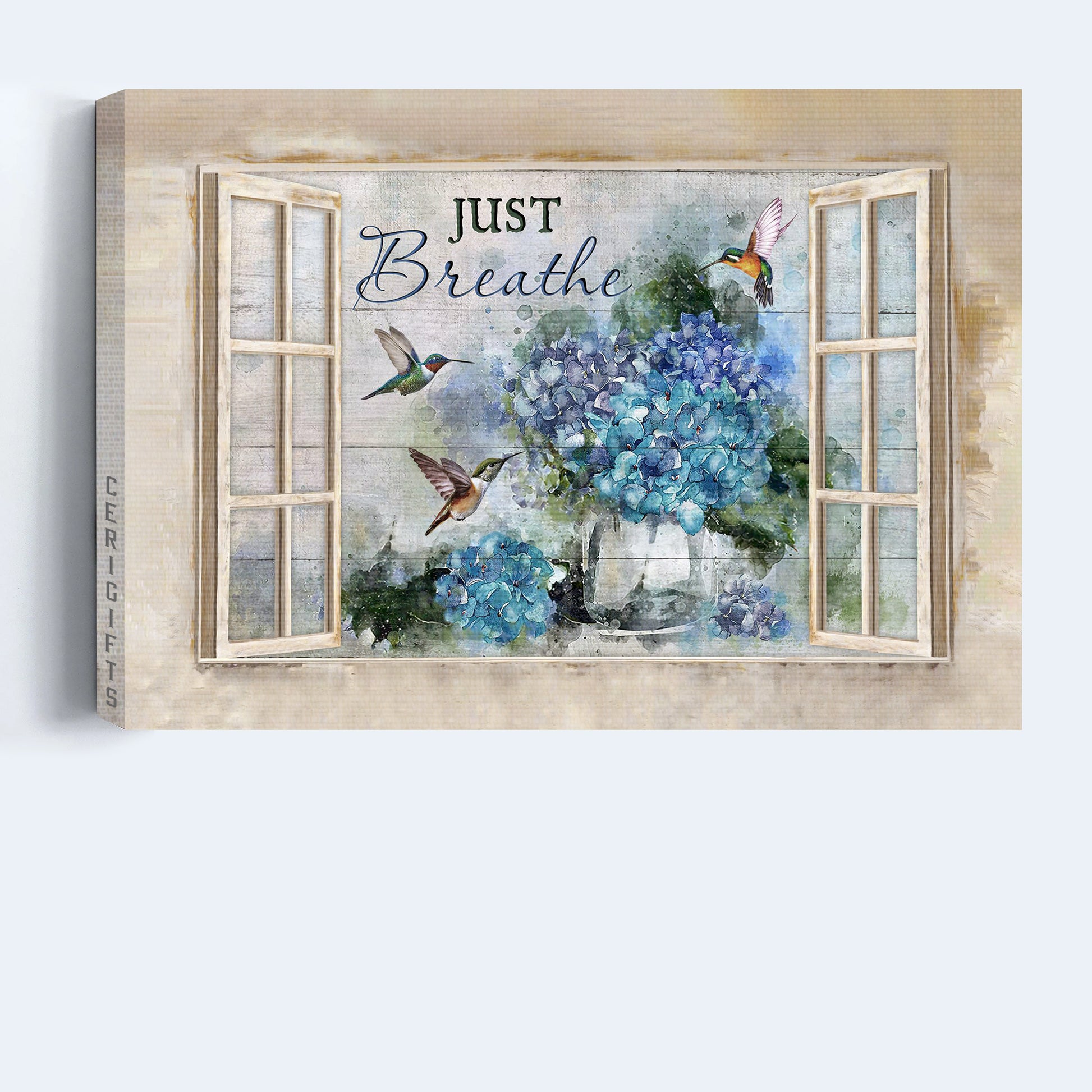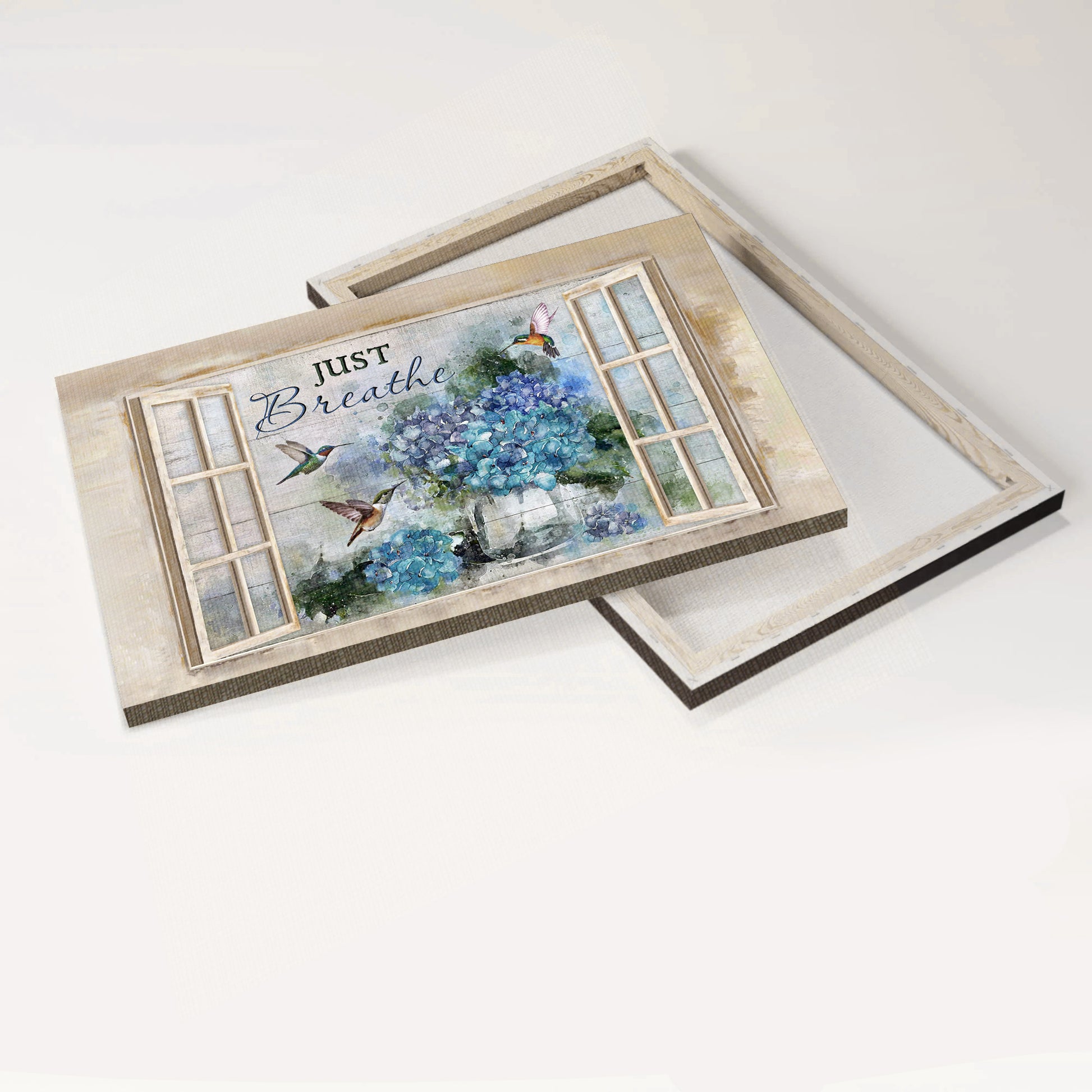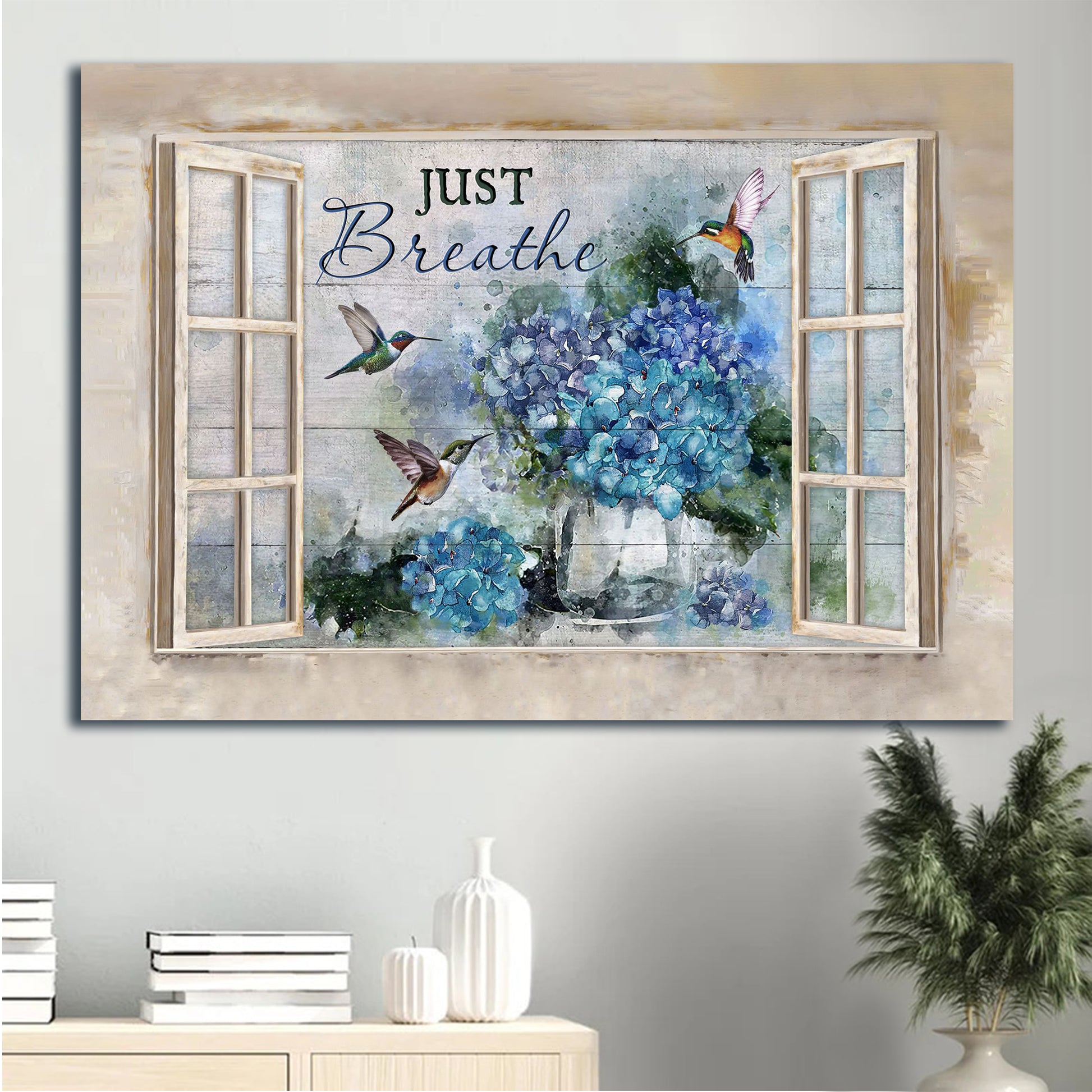Blue hydrangea, Green hummingbird, Window frame, Just breathe - Jesus Landscape Canvas Prints, Christian Wall Art is the perfect gift for your friend and your lover and your family.