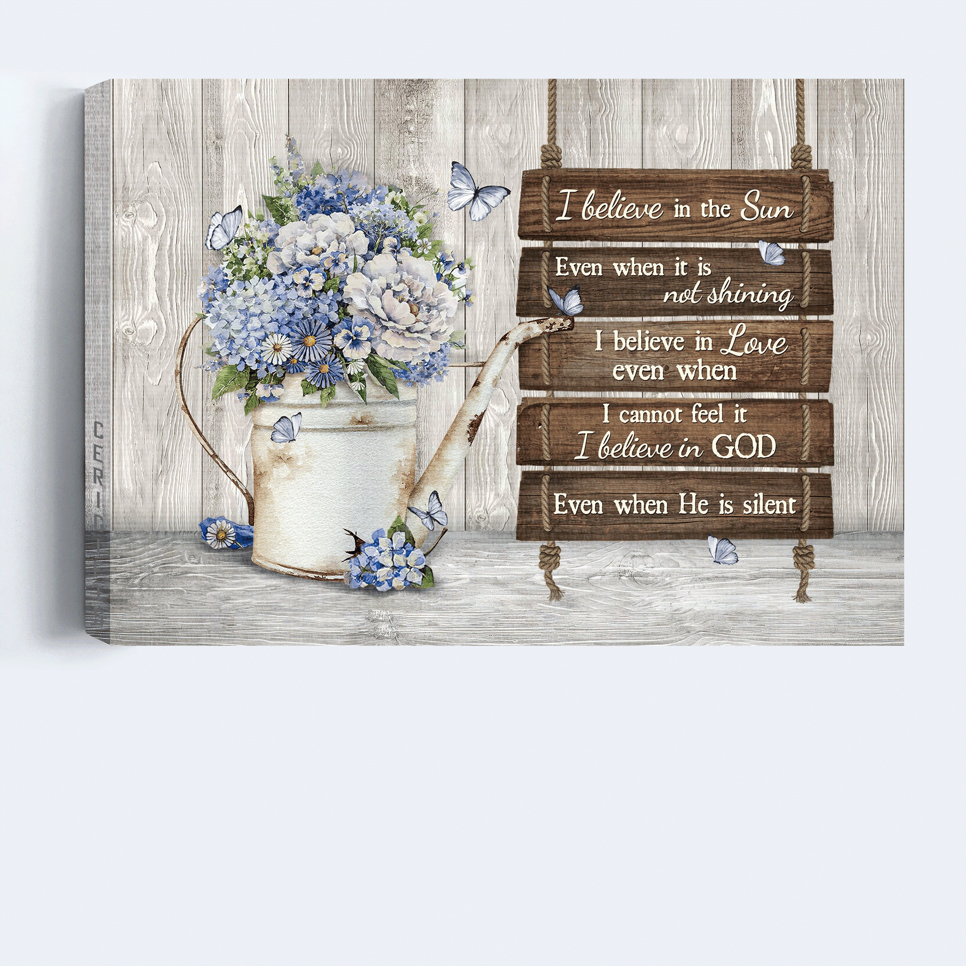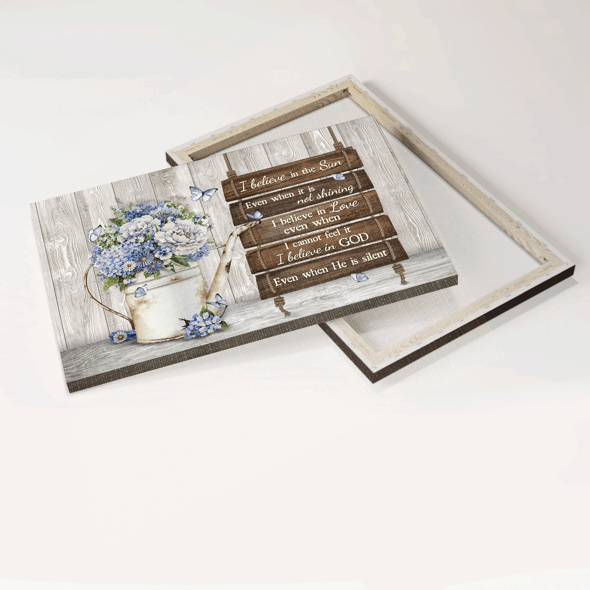 Jesus Landscape Canvas- Blue hydrangea, White flower, Pretty butterfly canvas- Gift for Christian- I believe in the sun - Landscape Canvas Prints, Christian Wall Art.