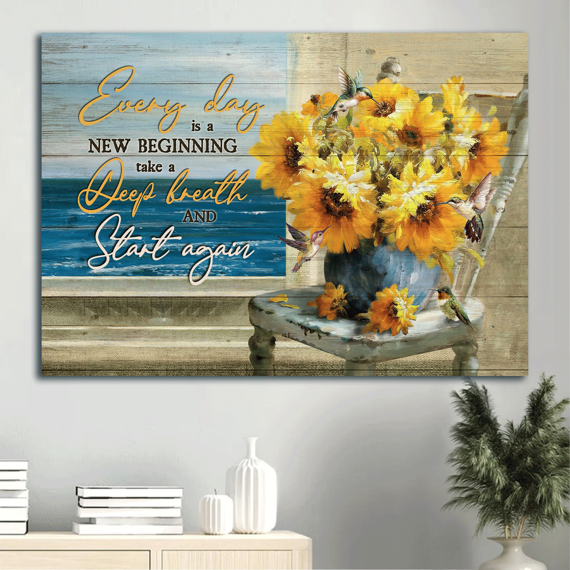 Jesus Landscape Canvas- Blue ocean drawing, Watercolor sunflower canvas- Gift for Christian- Every day is a new beginning - Landscape Canvas Prints, Wall Art.