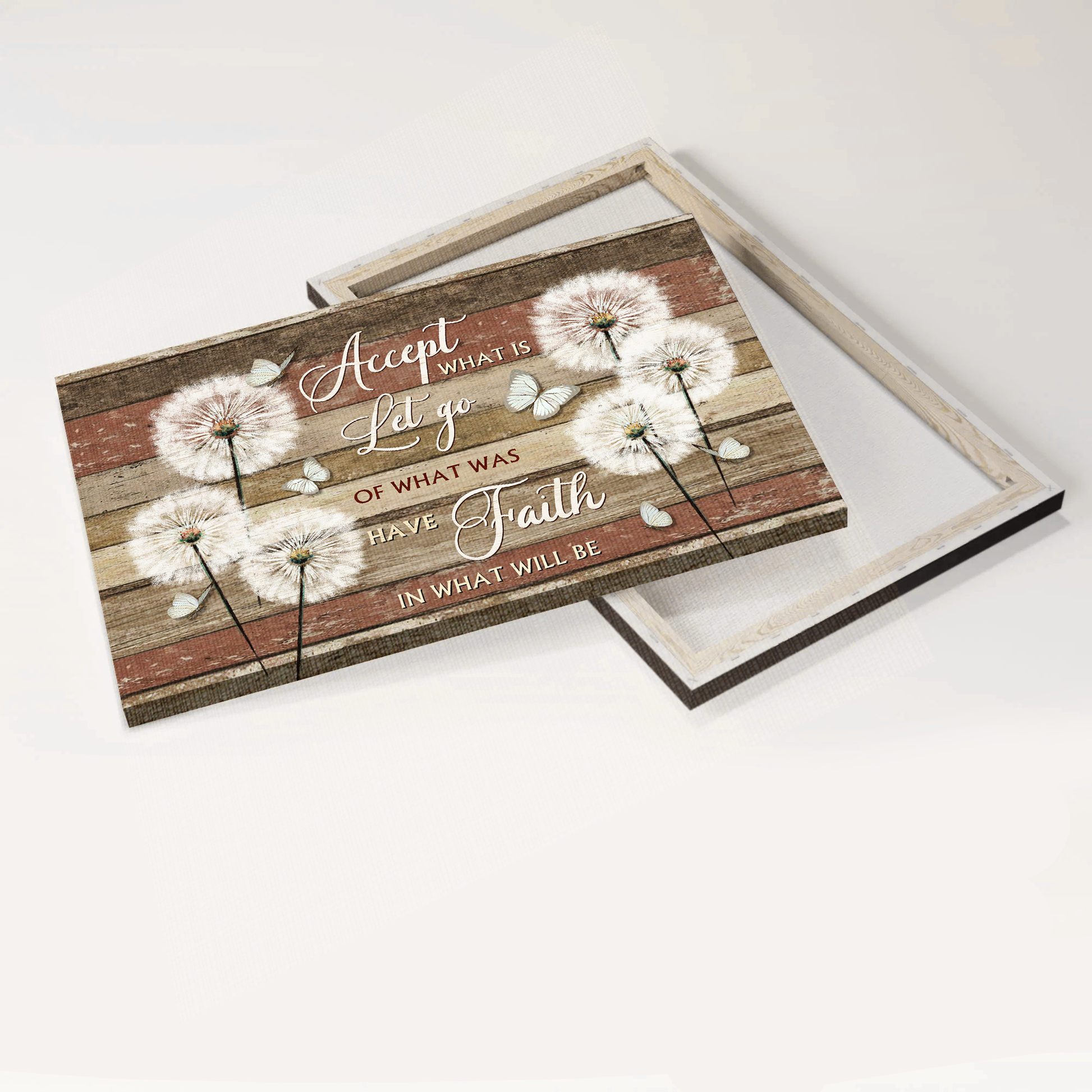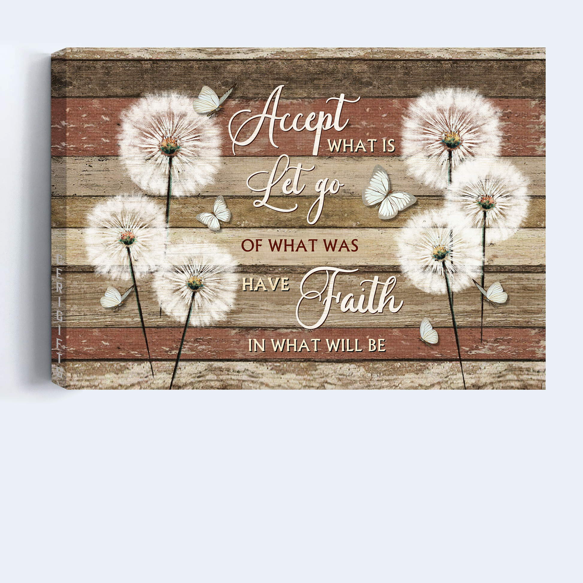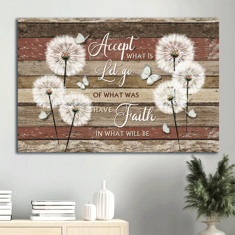 Jesus Landscape Canvas- Brilliant dandelion field, White butterfly canvas- Gift for Christian- Accept what is let go - Landscape Canvas Prints, Christian Wall Art with the quote "Accept What Is Let Go Of What Was And Have Faith In What Will Be" can be displayed on the wall of your home's living room, kitchen, bedroom, bathroom, or outdoor space. They can also be hung on the walls of your office, building, hotel, restaurant, or even coffee shop.