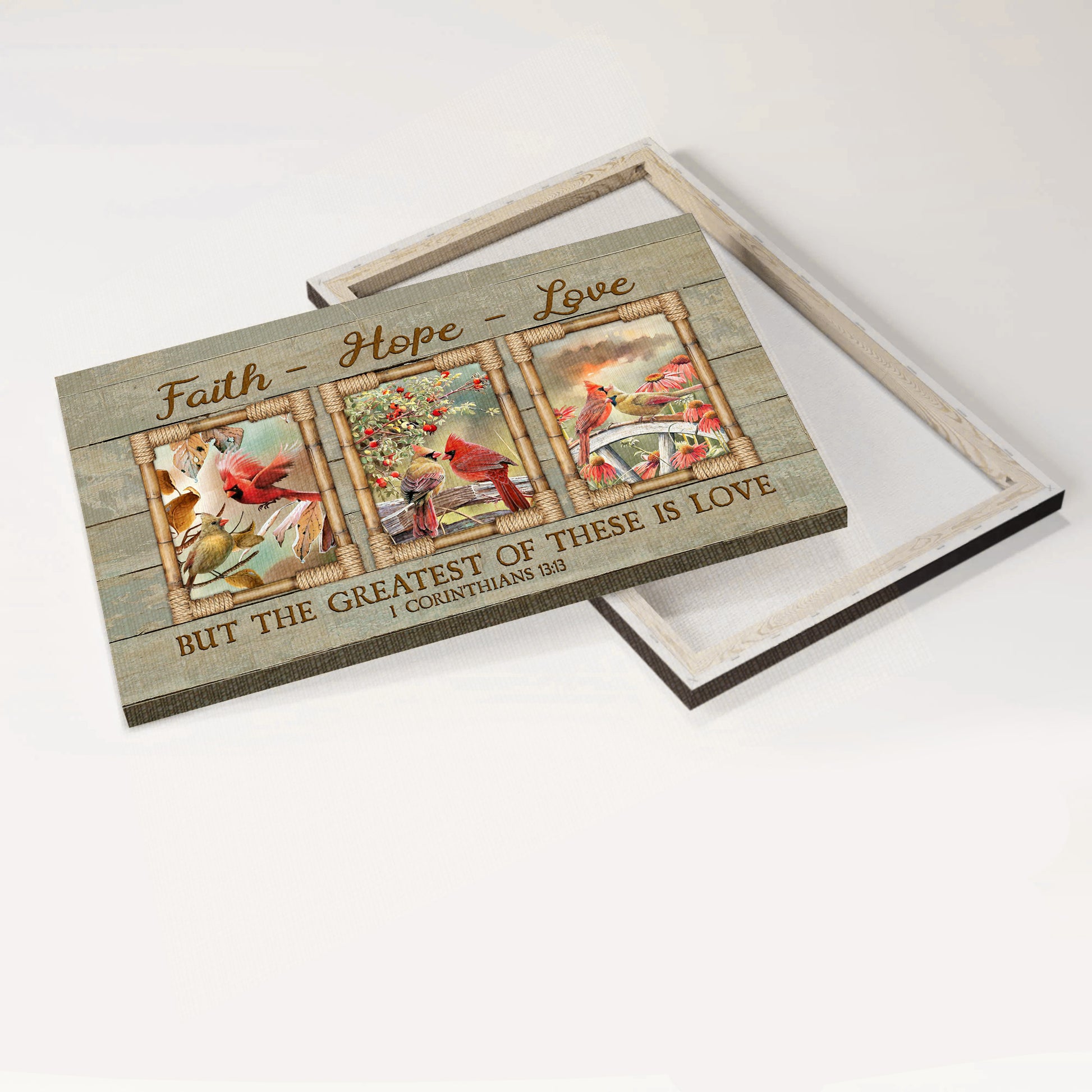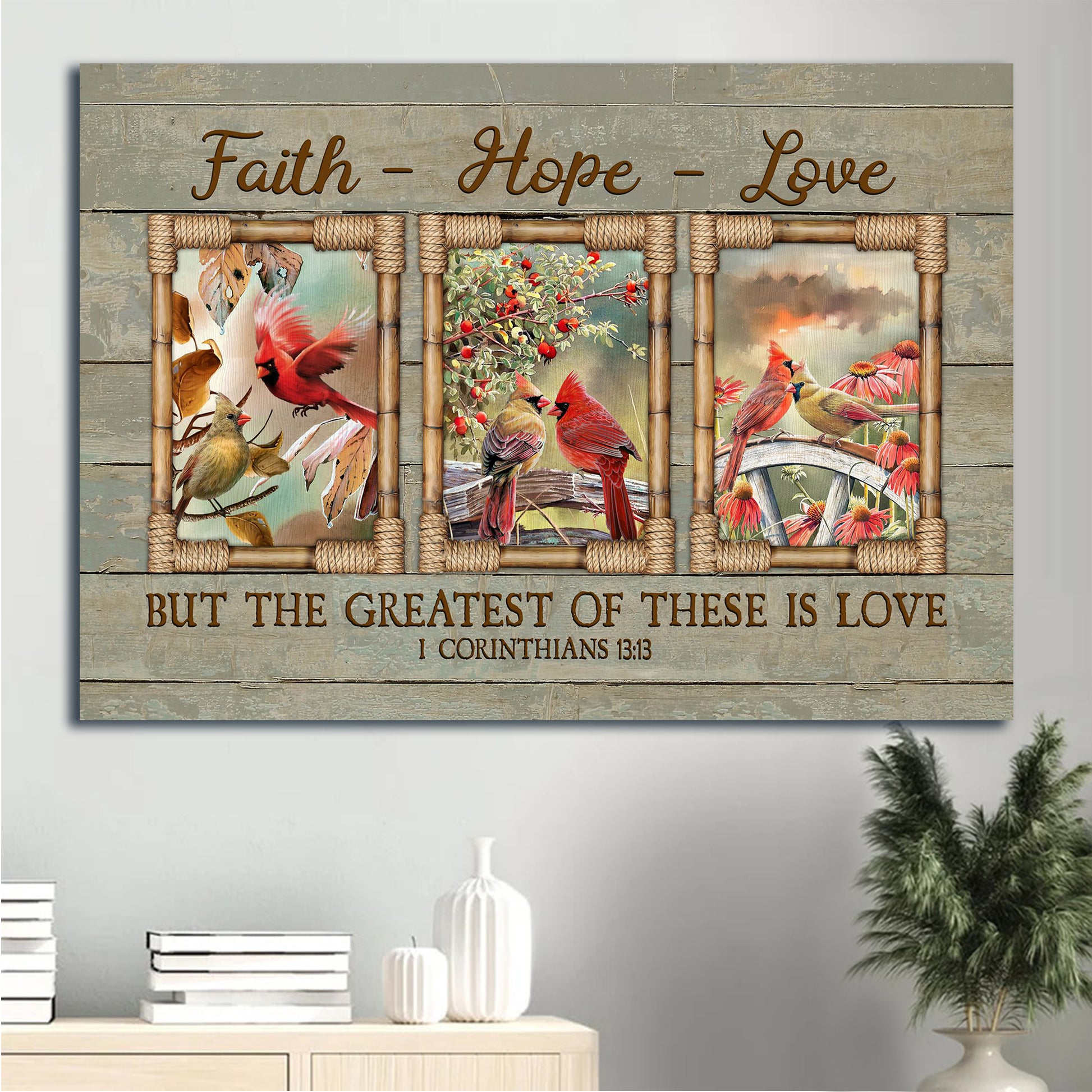 Let's hang Cardinal couple, Bible verse, Flower garden, Faith hope love - Jesus Landscape Canvas Prints, Christian Wall Art in any room in your house, such as the living room, bedroom, kitchen, or even outdoor space.