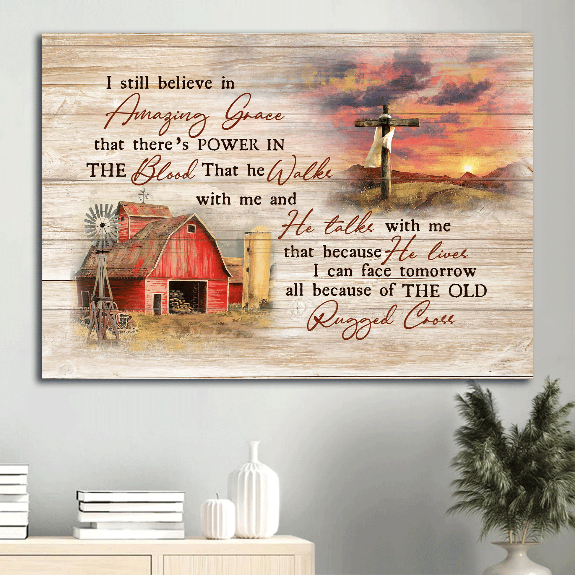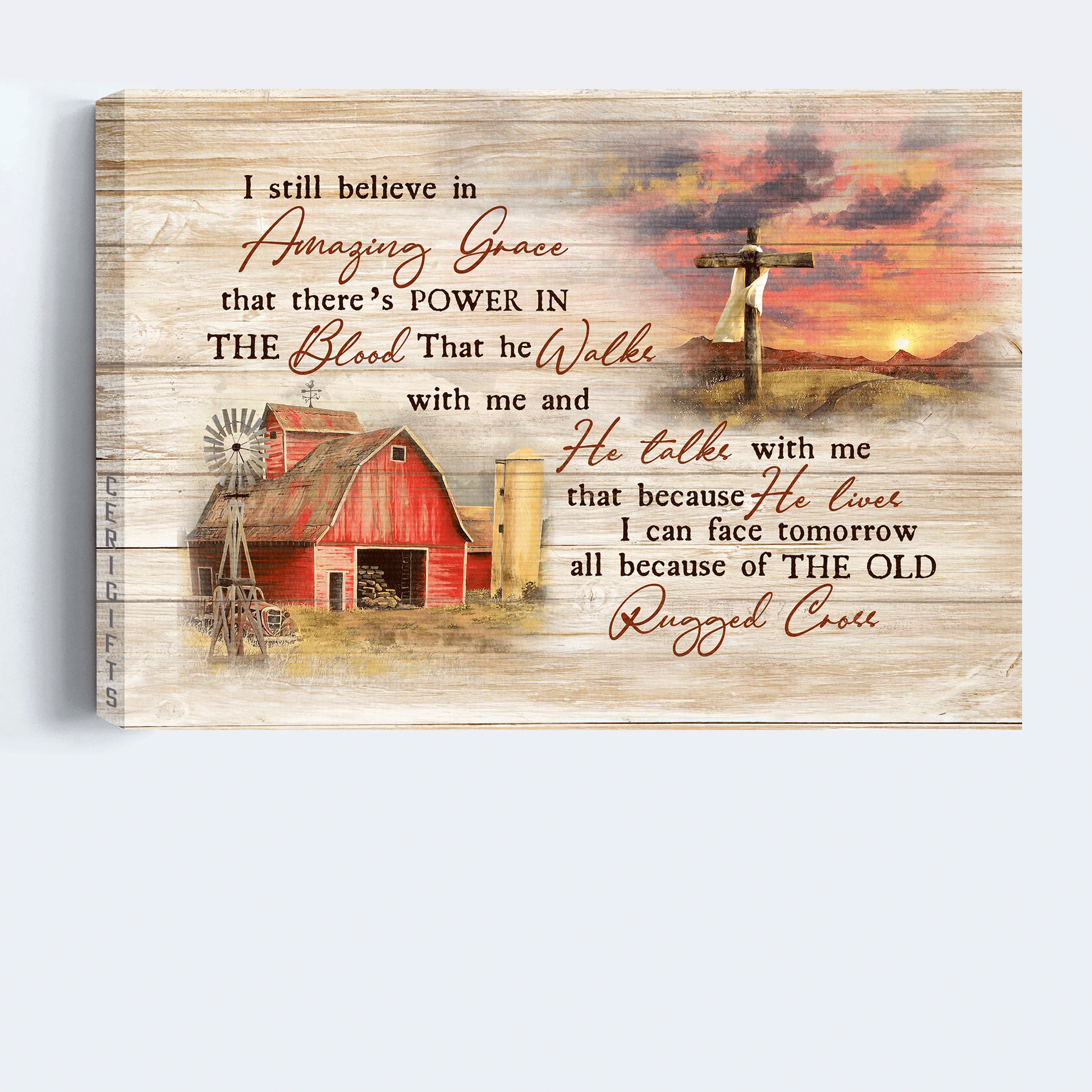Jesus Landscape Canvas - Old Barn Painting, Dawn, Wooden Cross Landscape Canvas - Gift For Christian - I still believe in amazing grace Landscape Canvas