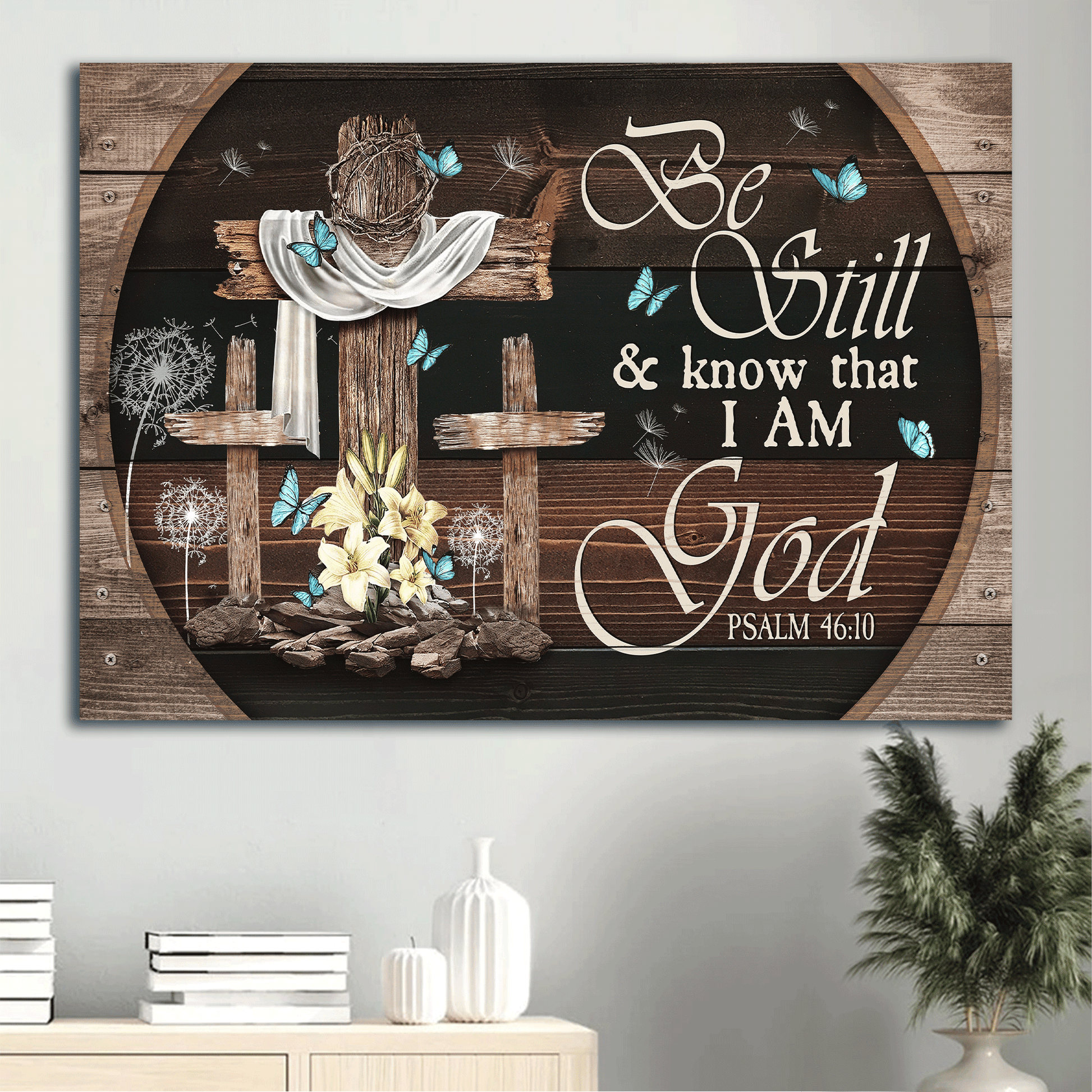 Jesus Landscape Canvas - Old cross, Blue butterfly, Beautiful lily Landscape Canvas - Gift For Christian - Be still and know that I am God Landscape Canvas