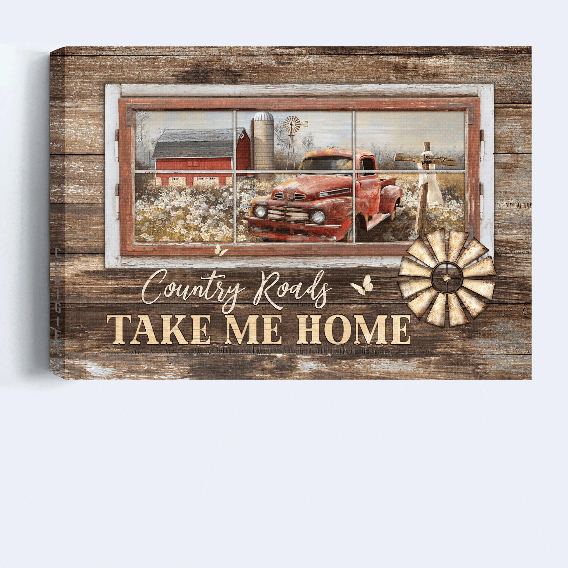 Jesus Landscape Canvas - Old red truck, Wooden cross, Tranquil flower field Landscape Canvas - Gift For Christian - Country roads take me home Landscape Canvas