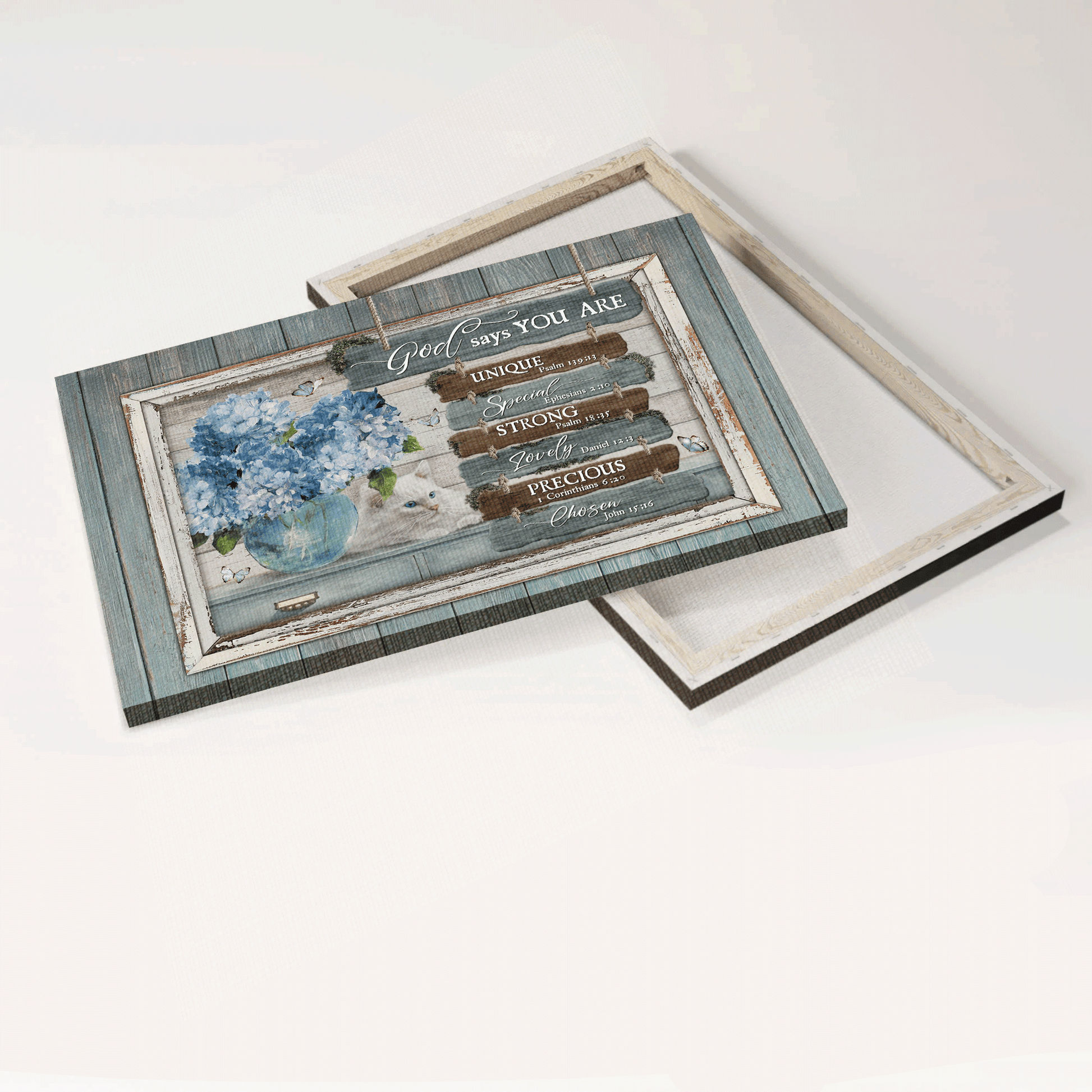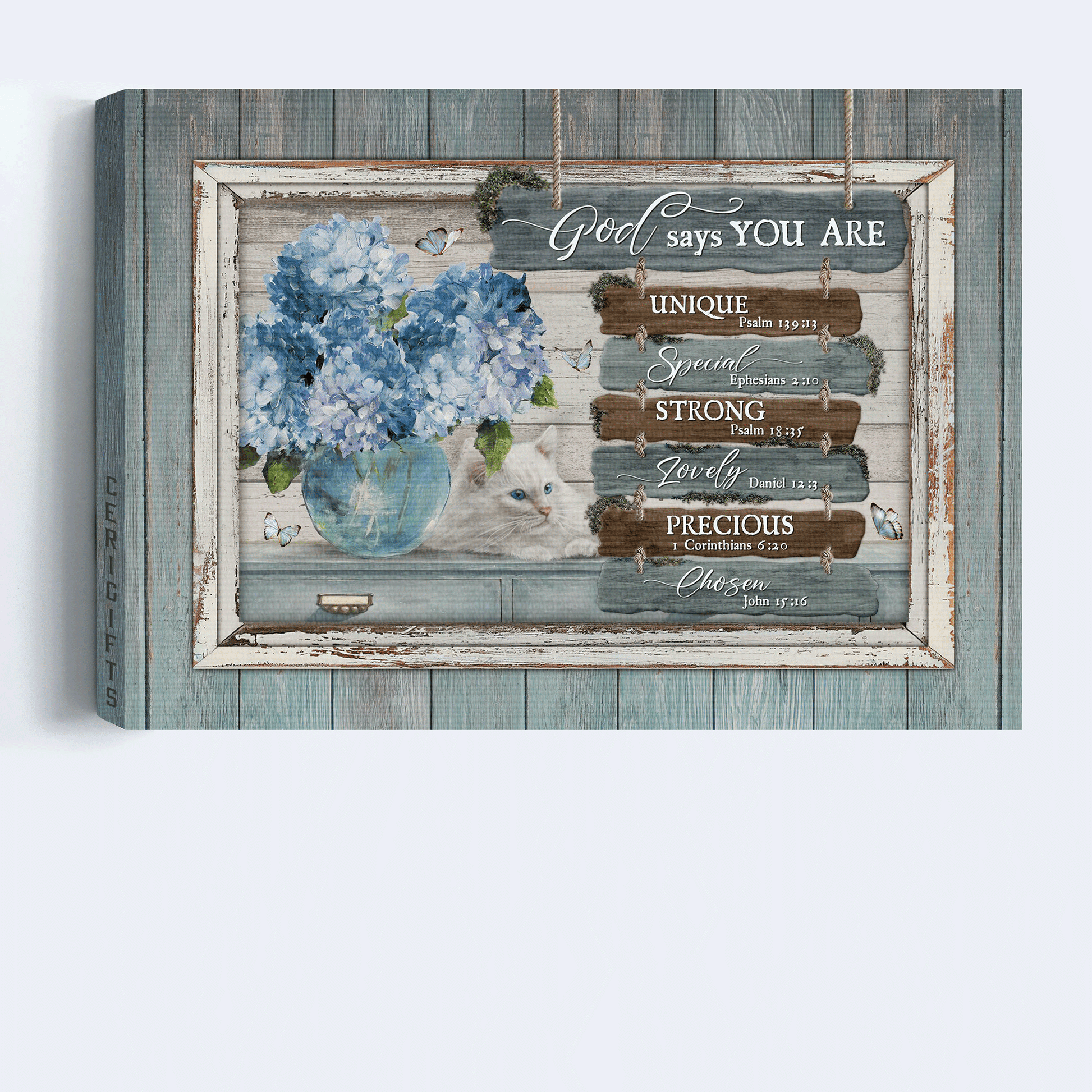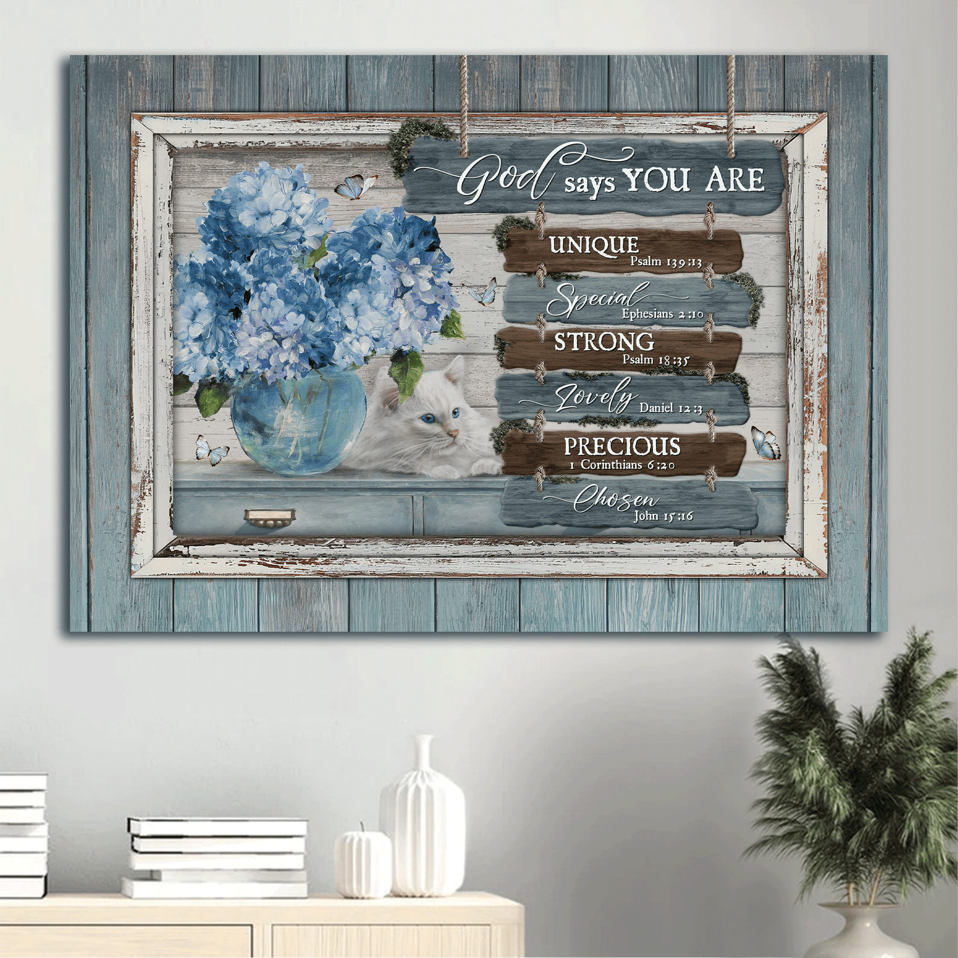 Jesus Landscape Canvas - Pretty blue hydrangeas, White cat Canvas - Gift for Christian - God says you are unique Landscape Canvas Prints, Christian Wall Art