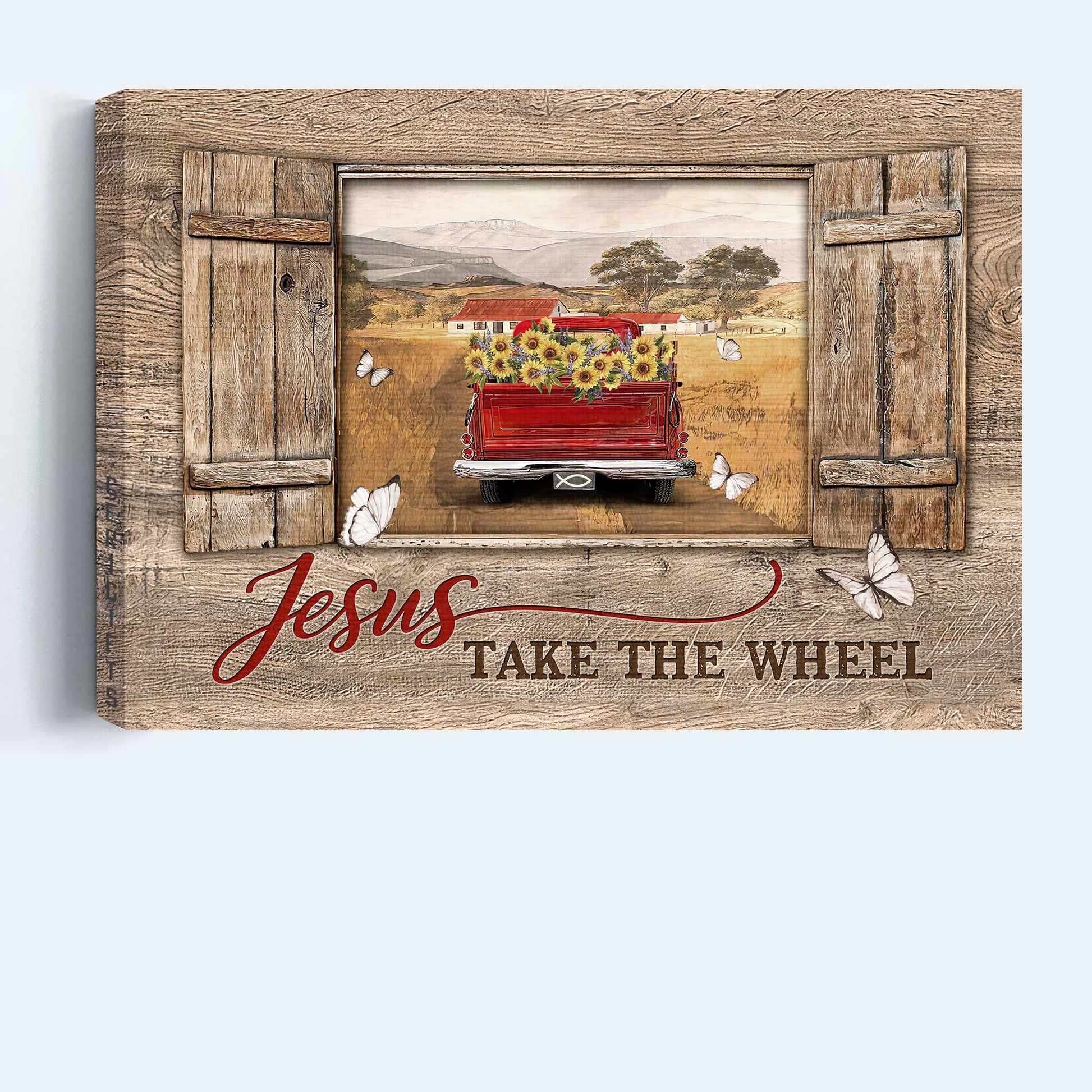 Jesus Landscape Canvas- Red truck painting, Window frame, Countryside landscape- Gift for Christian- Vintage village, Jesus take the wheel - Landscape Canvas Prints, Christian Wall Art
