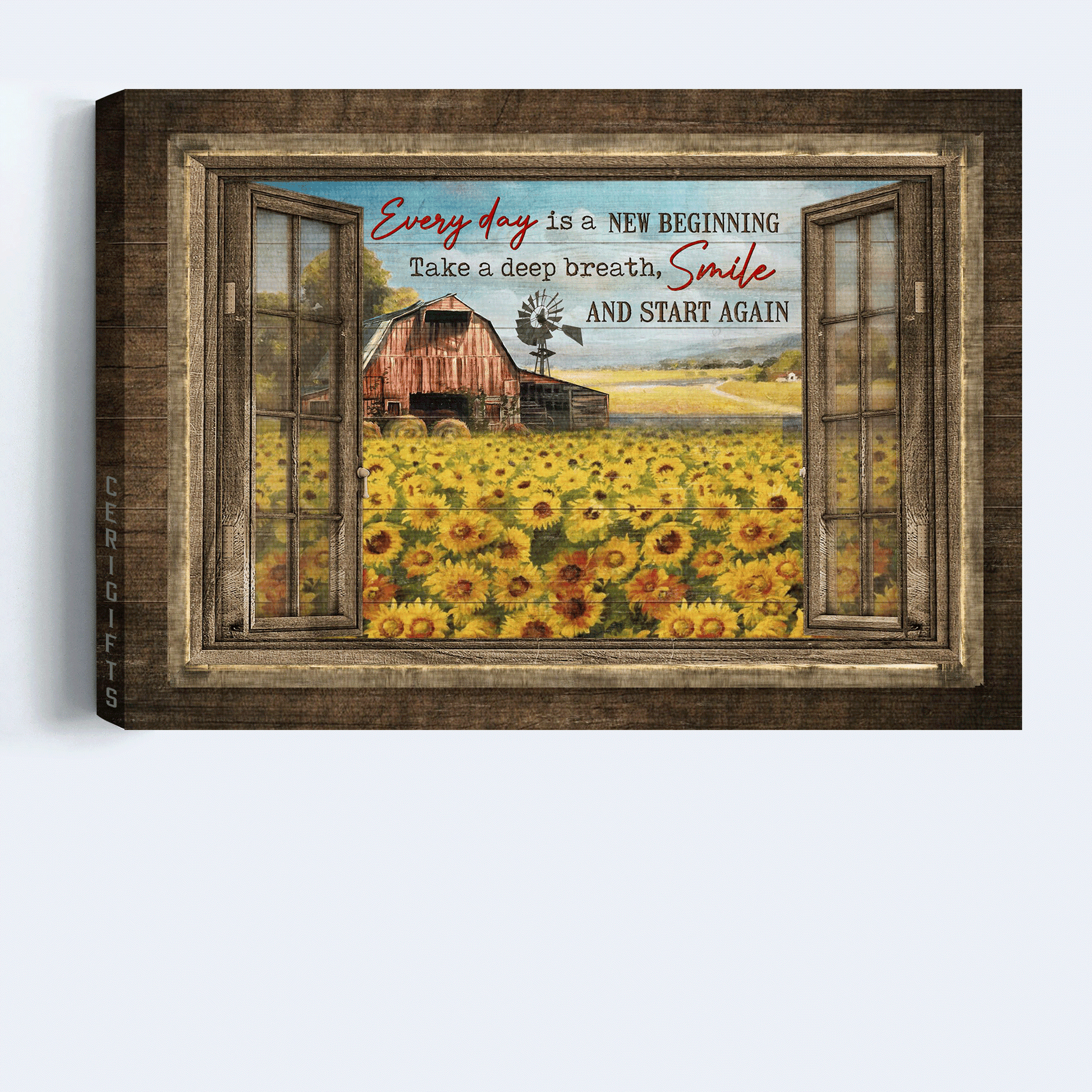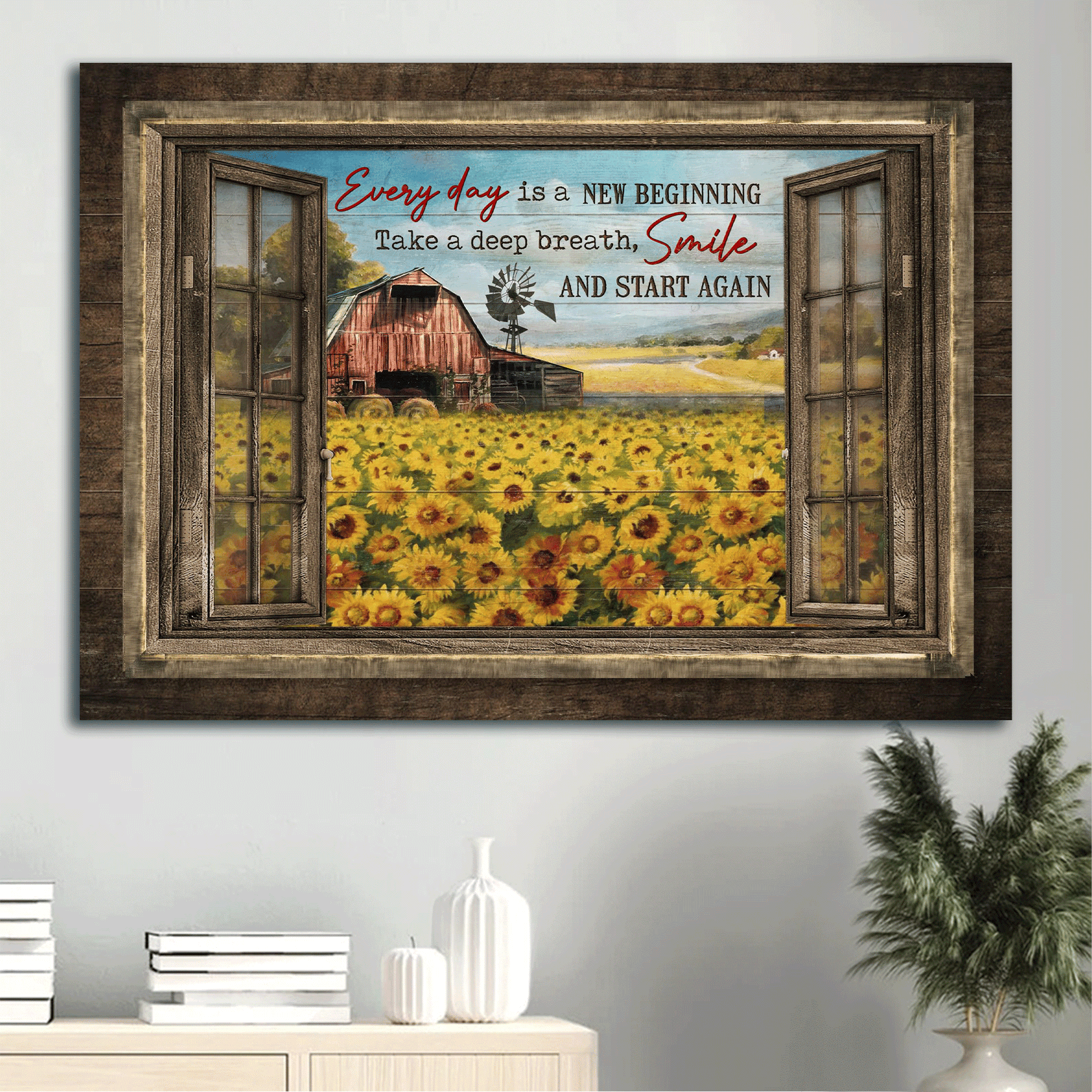 Jesus Landscape Canvas - Sunflower Field, Red Barn, Window Frame Canvas - Every Day Is A New Beginning Canvas Prints, Wall Art is suitable for any room in your house.