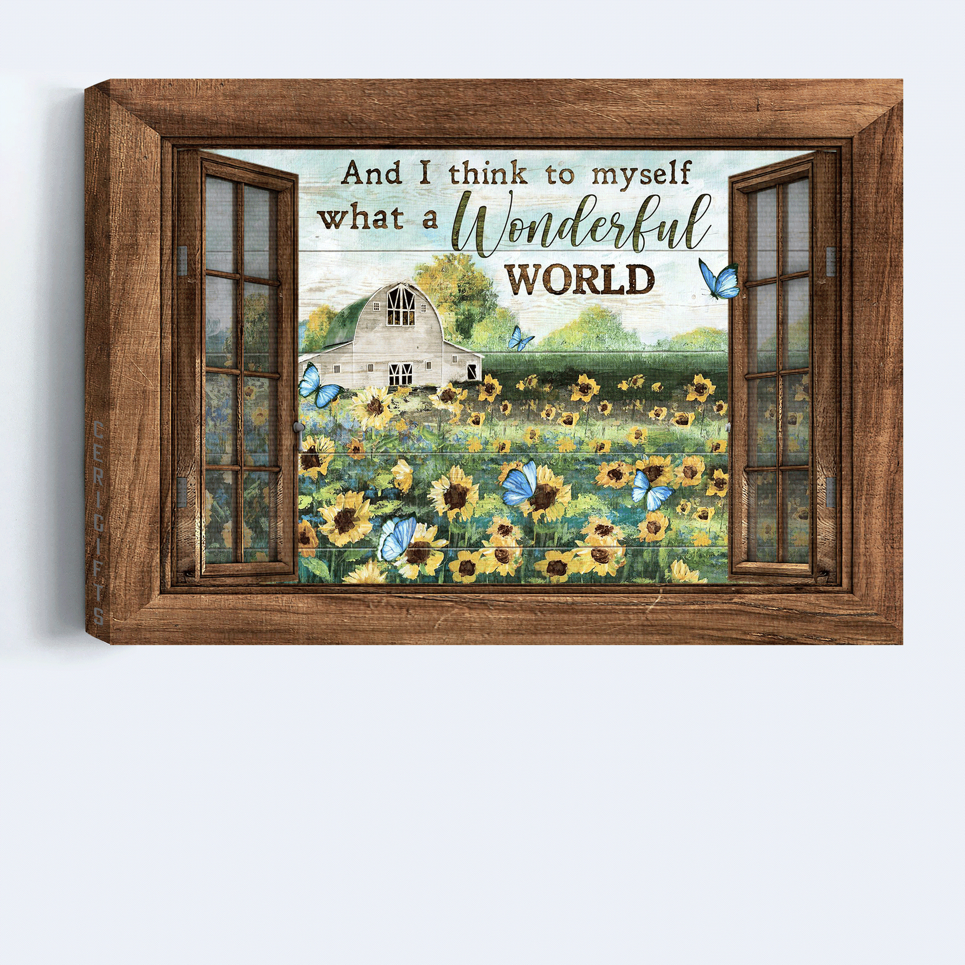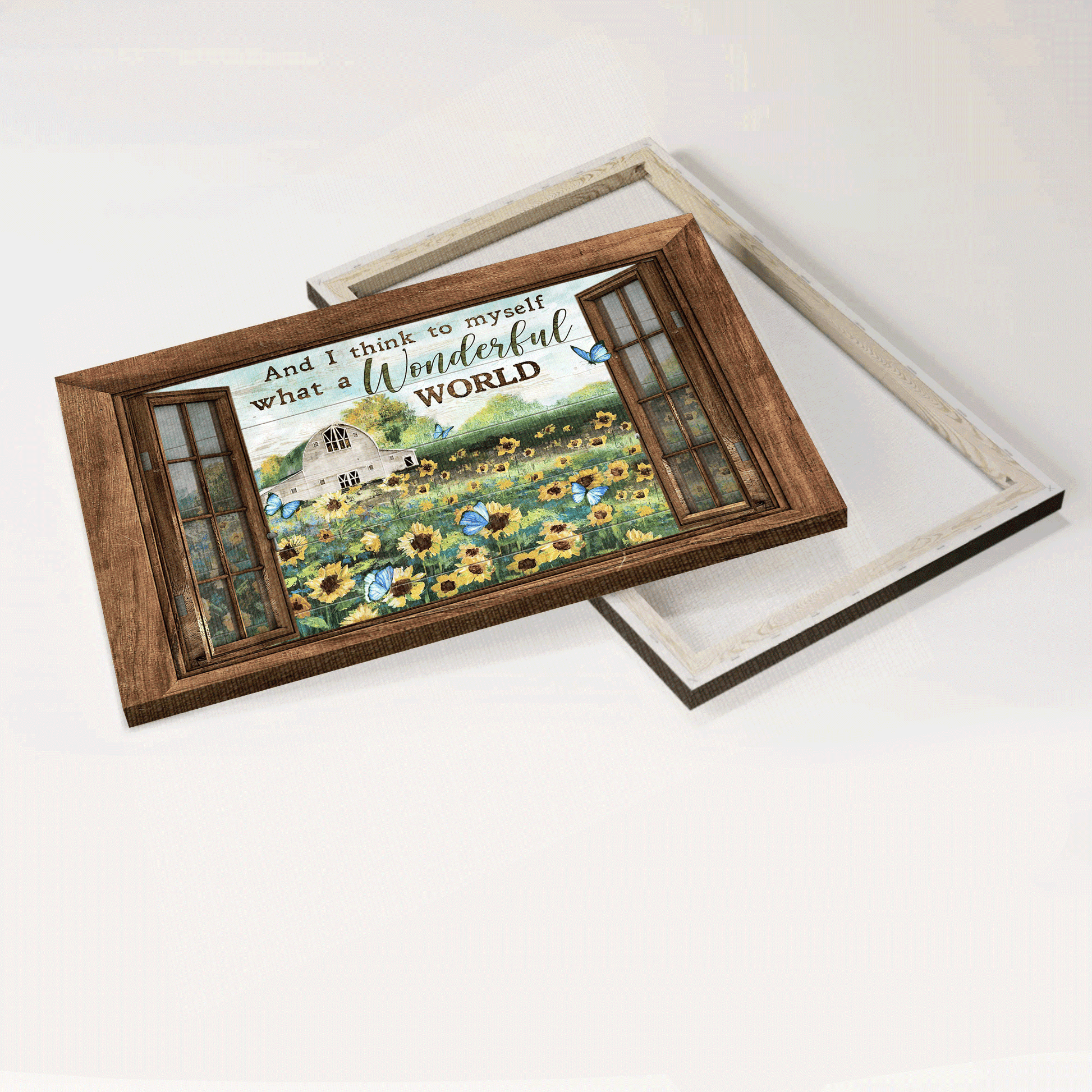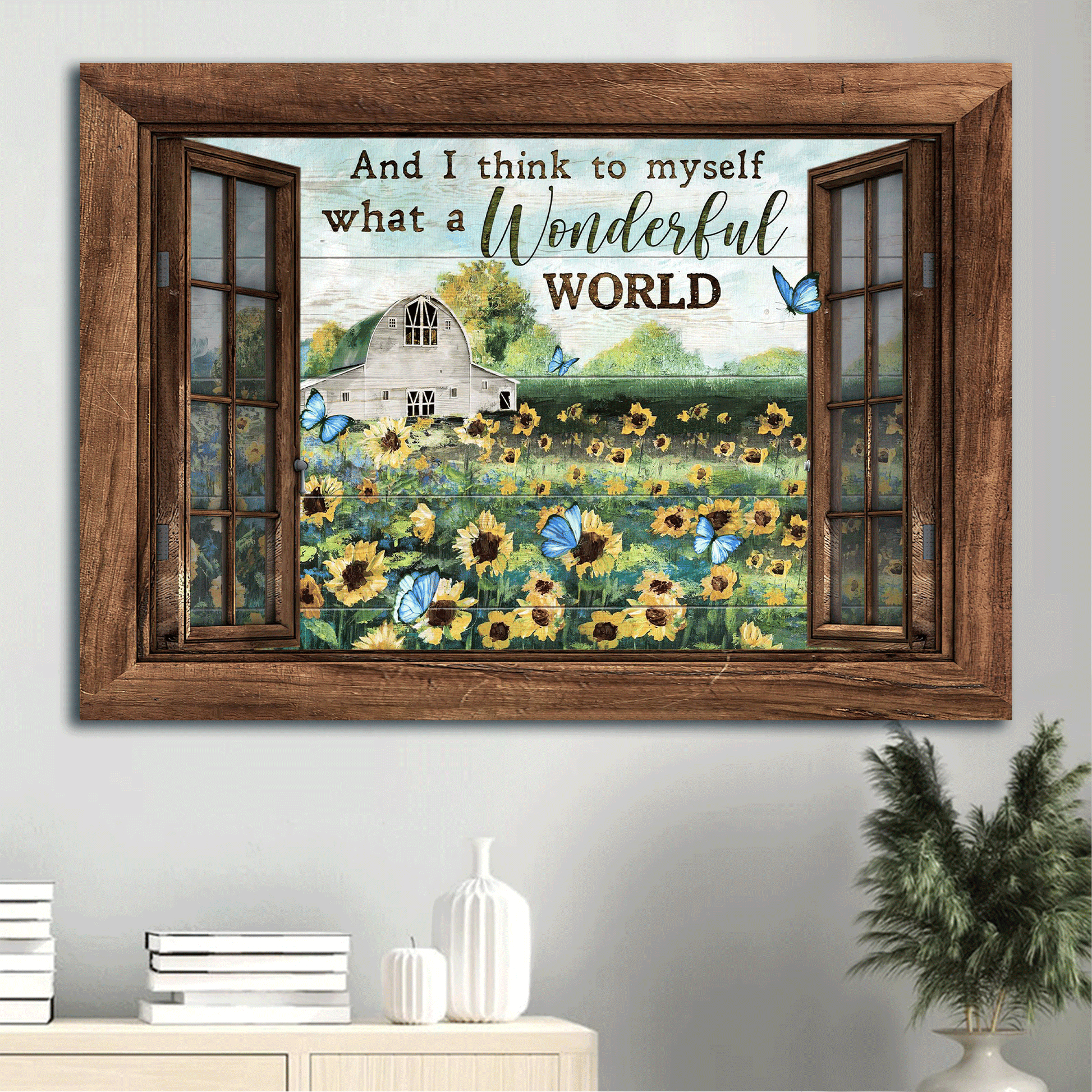Do you want to add some joy to your living space? Then, this amazing Jesus Landscape Canvas - Sunflower Filed, Blue Butterflies, Outside The Window, Window Frame Canvas - Gift For Christian - And I Think To Myself What A Wonderful World It Is Canvas Prints, Wall Art is the perfect option for you!