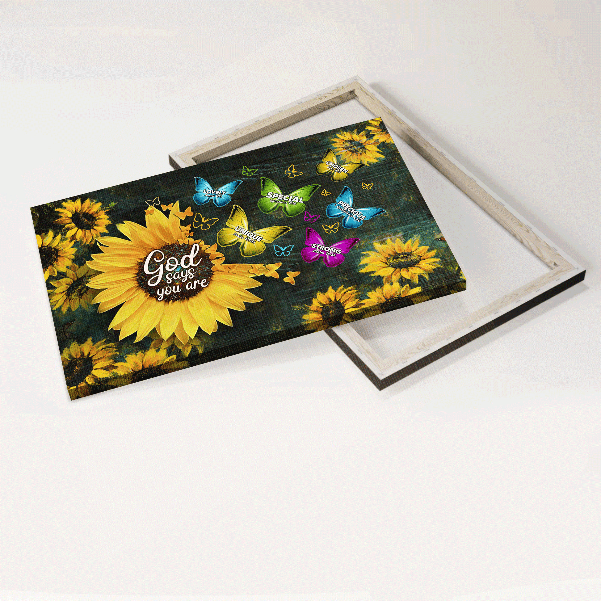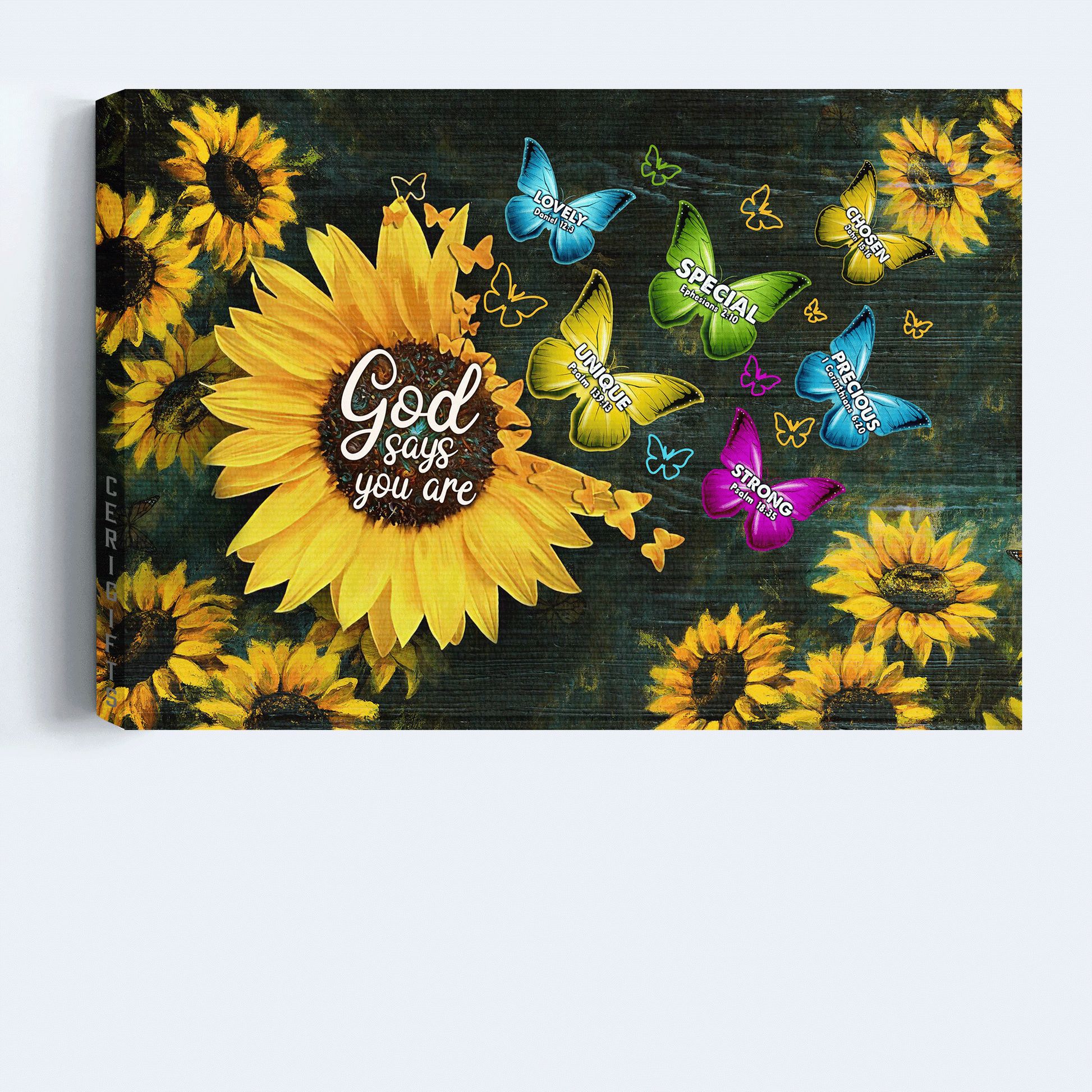 Do you want to add some joy to your living space? Then, this amazing Jesus Landscape Canvas - Sunflower Painting, Colorful Butterfly, Dark Blue Background Canvas - Gift For Christian - God Says You Are Canvas Prints, Wall Art is the perfect option for you!