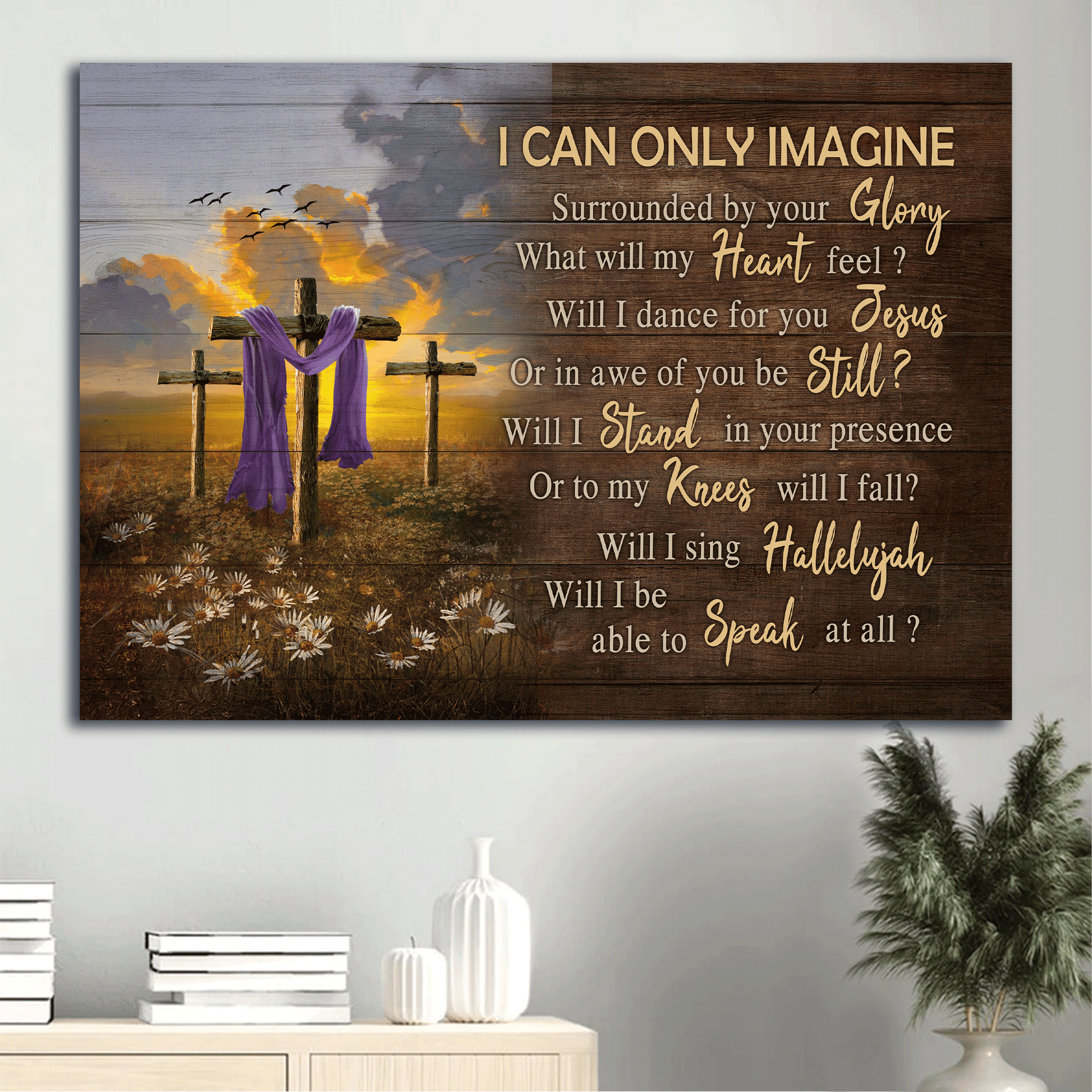 The image of the three old rugged crosses with daisy field and meaningful quotes of this amazing Jesus Landscape Canvas - The Old Rugged Cross, Daisy Flower Field Canvas - Gift For Christian - I Can Only Image Canvas Prints, Wall Art will definitely be a meaningful gift not only for your friend but also for your lover and your family. This wonderful canvas will be suitable for any room in your house from the kitchen, bedroom, and living room to outside space.