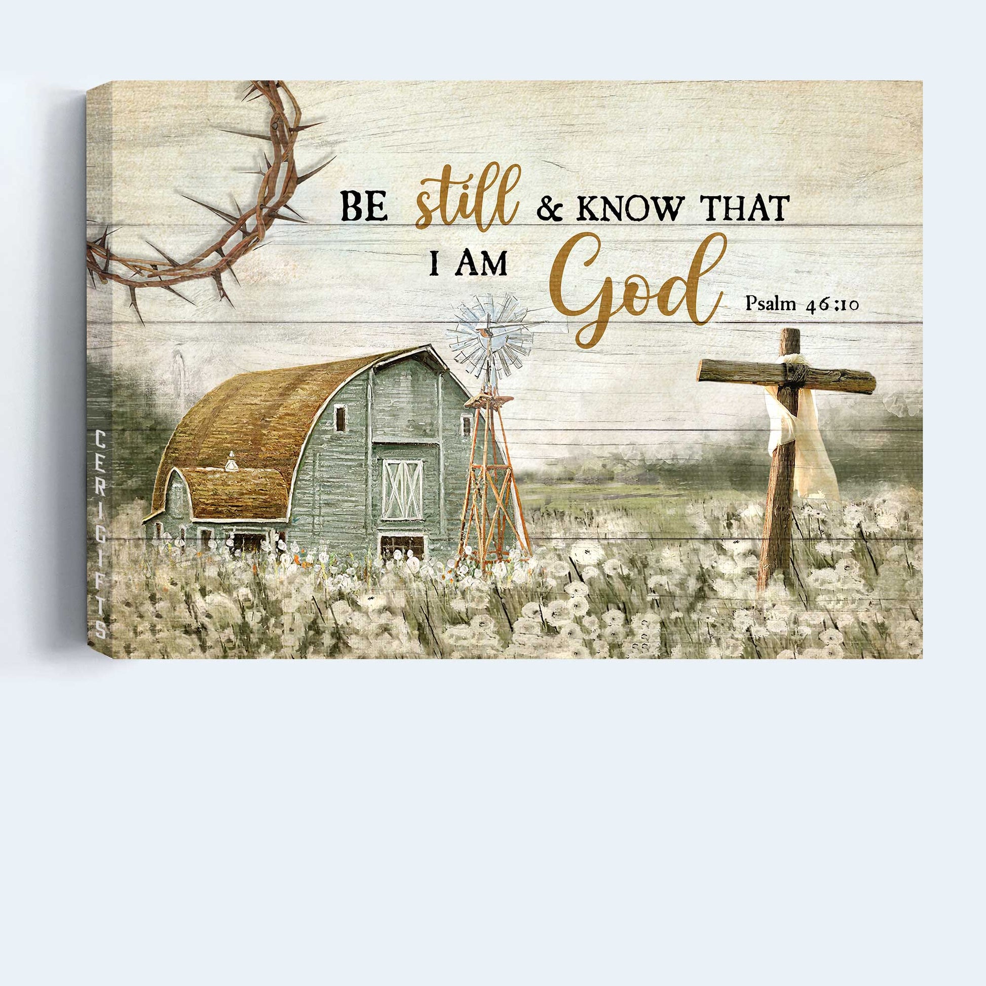 Jesus Landscape Canvas - Vintage House Painting, Wooden Cross, Beautiful Life On Farm Canvas - Gift For Christian - Be Still And Know That I Am God