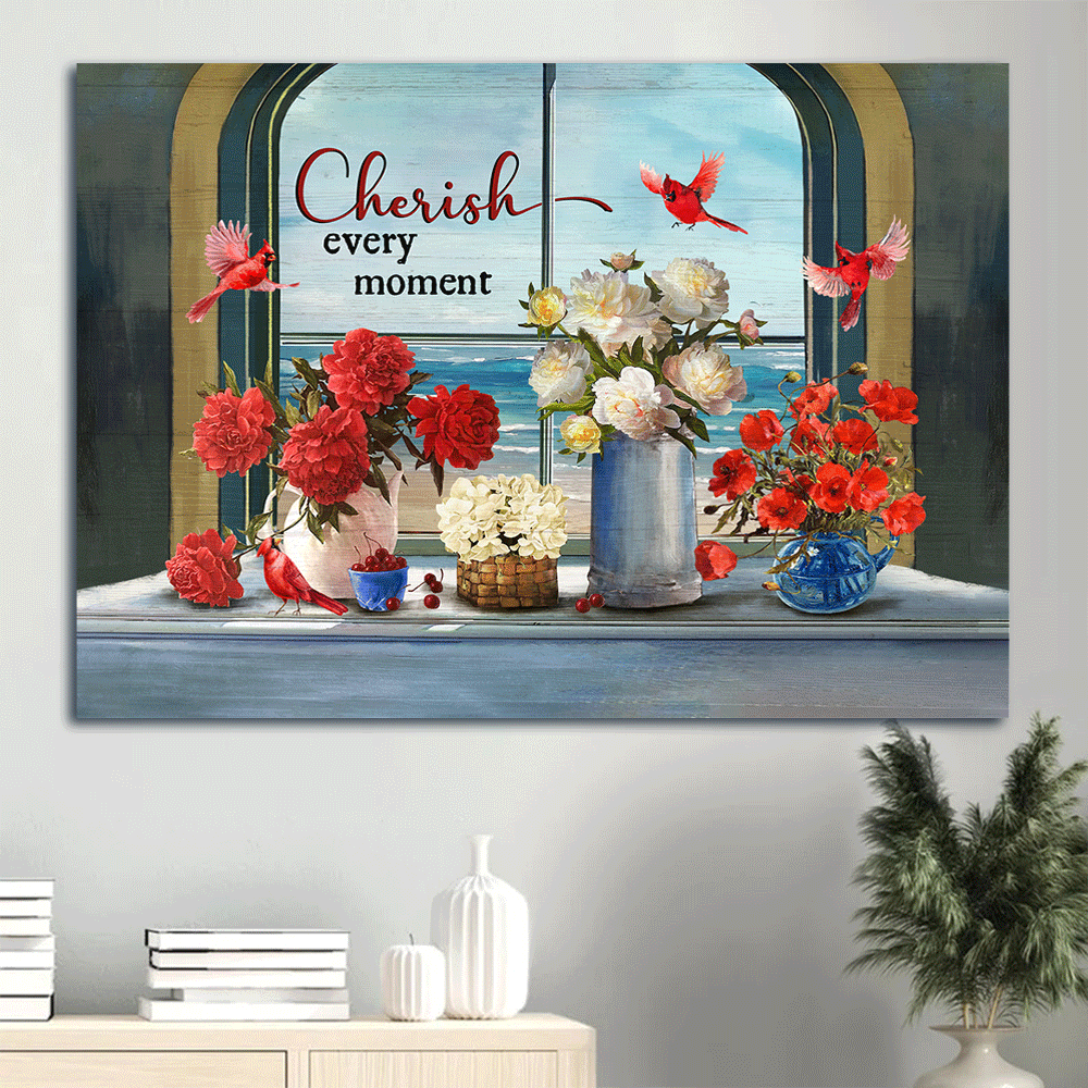 Jesus Landscape Canvas - Vintage Painting, Cardinals, Red And White Flower Vase, Beach View Window Canvas - Gift For Christian - Still Life Drawing Cherish Every Moment Canvas Prints, Christian Wall Art is a wonderful picture that can be hung in any room in your house, such as the living room, bedroom, kitchen, or even outdoor space.