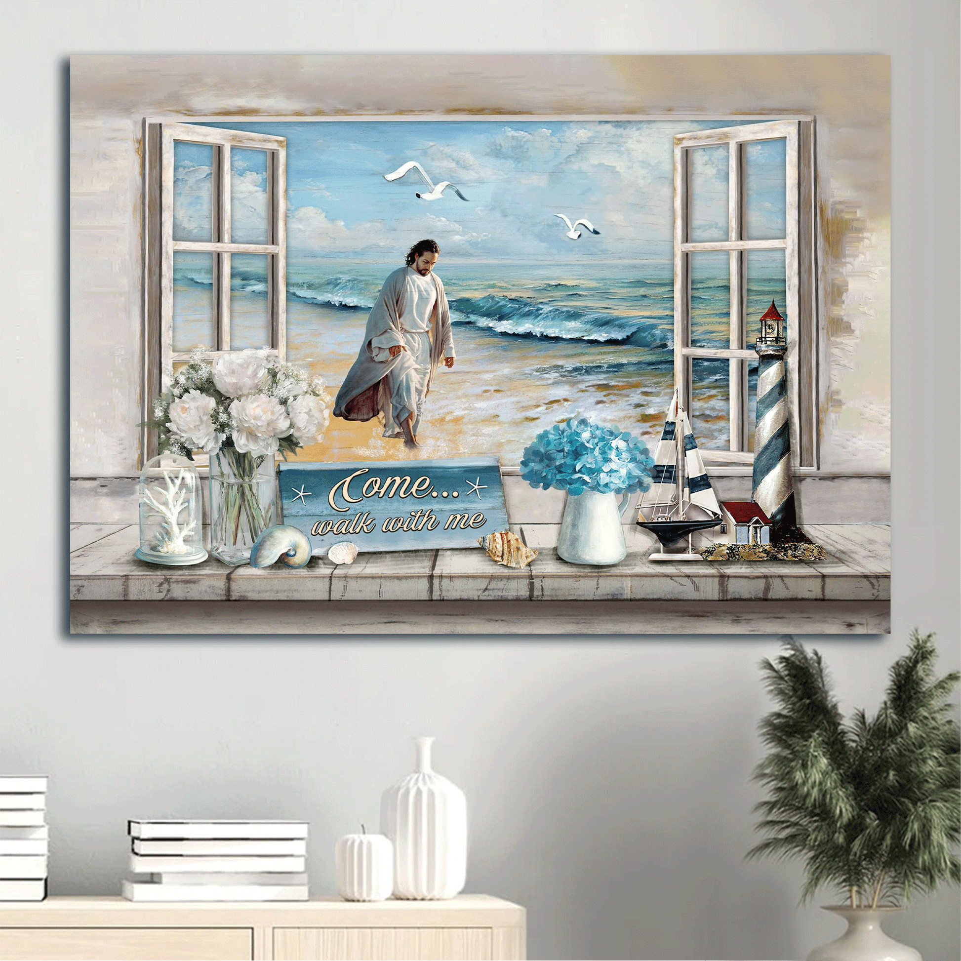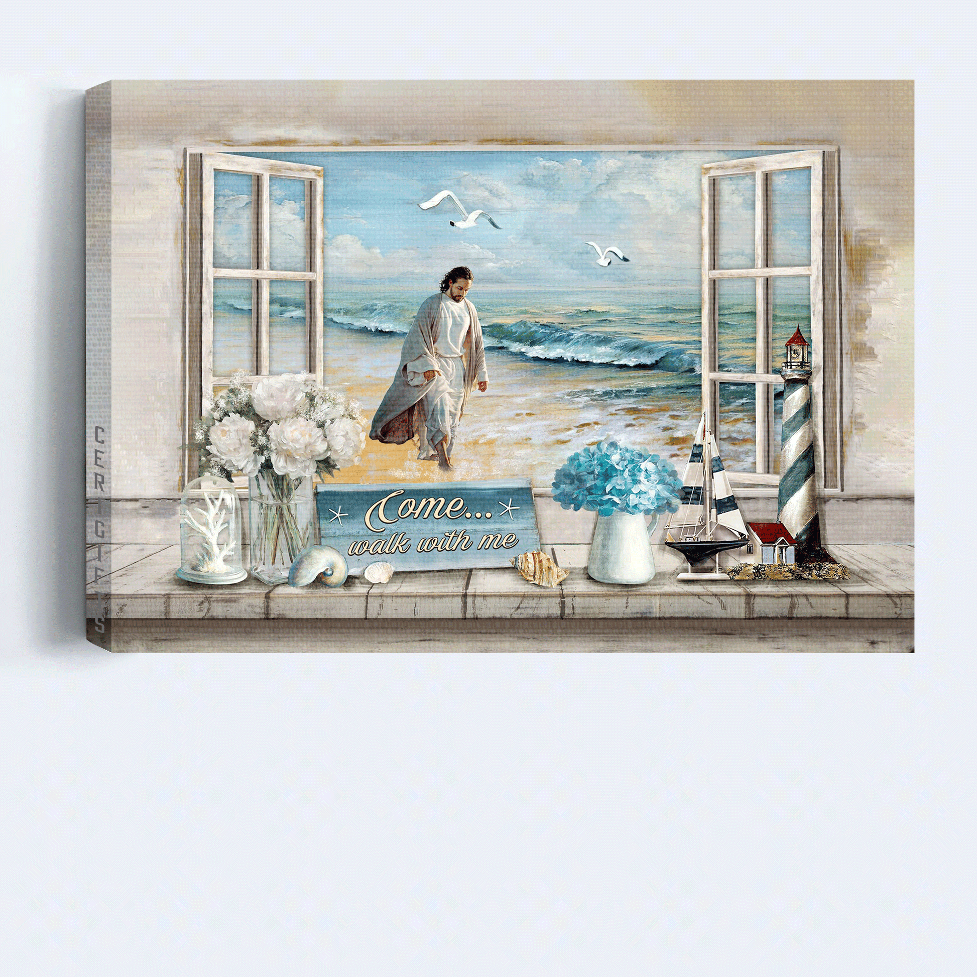 Jesus Landscape Canvas - Walking With Jesus, On The Seashore, Beach Painting, Window Frame Canvas - Gift For Christian - Come Walk With Me Canvas Prints, Christian Wall Art is a wonderful picture that can be hung in any room in your house such as living room, bedroom, kitchen or even outdoor space.