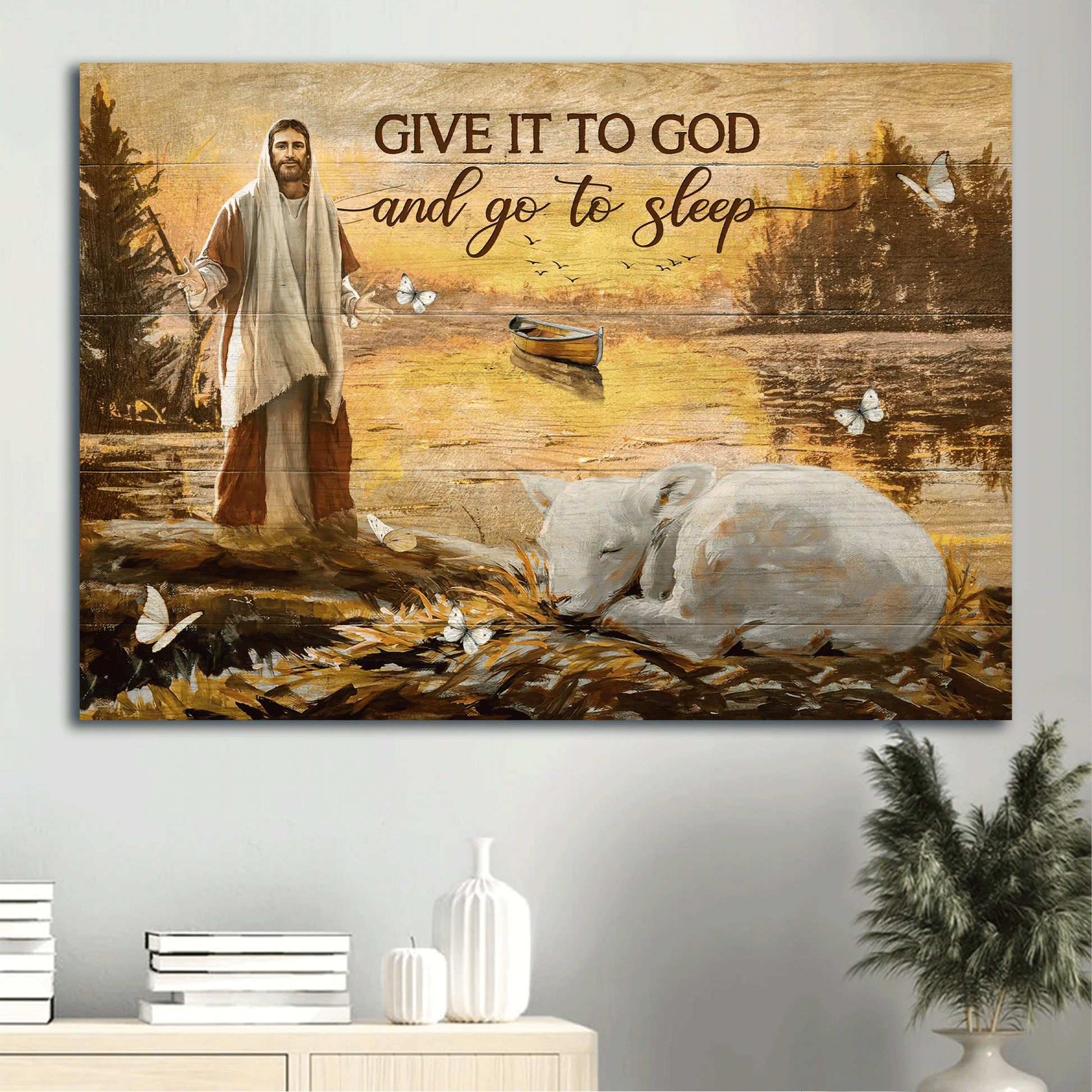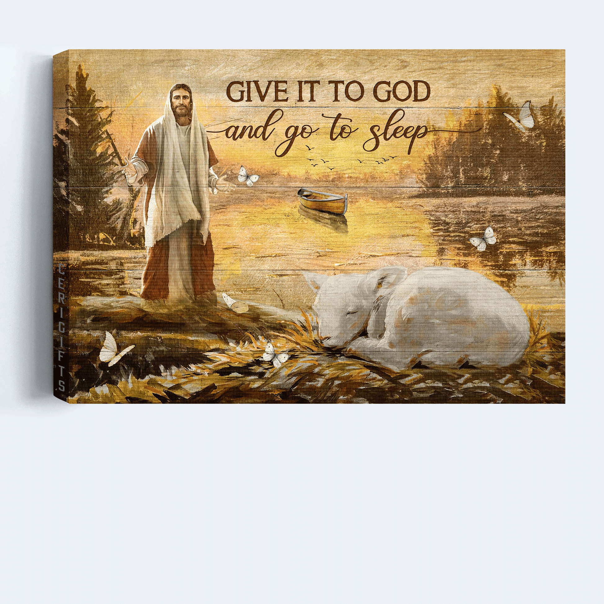 The image of the Jesus with lamb and meaningful quotes of this amazing Jesus Landscape Canvas - Watercolor Lamb, Magic Lake, The Life Of Jesus Canvas - Gift For Christian - Give It To God And Go To Sleep Canvas Prints, Wall Art will definitely be a meaningful gift not only for your friend but also for your lover and your family. This wonderful canvas will be suitable for any room in your house from the kitchen, bedroom, and living room to outside space.