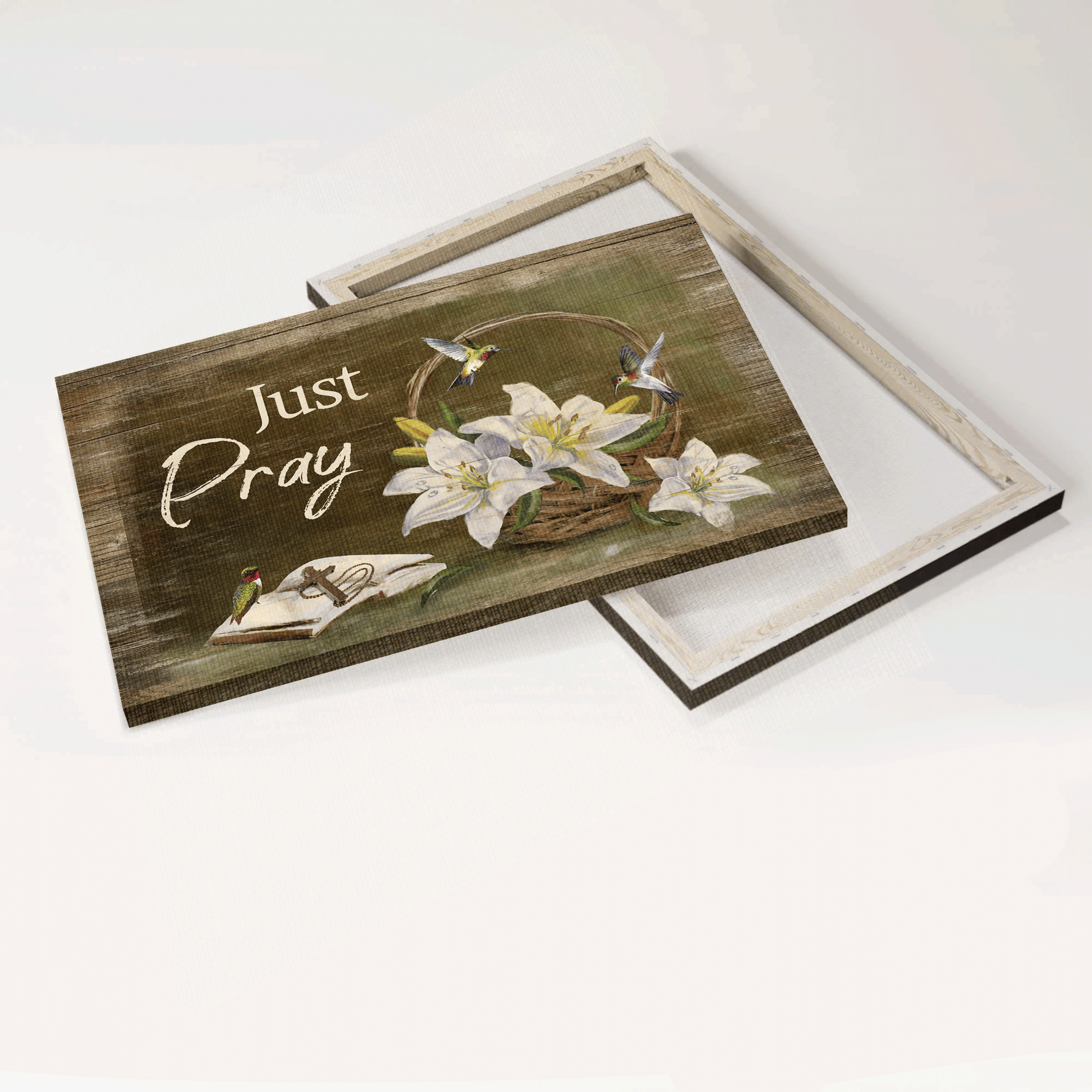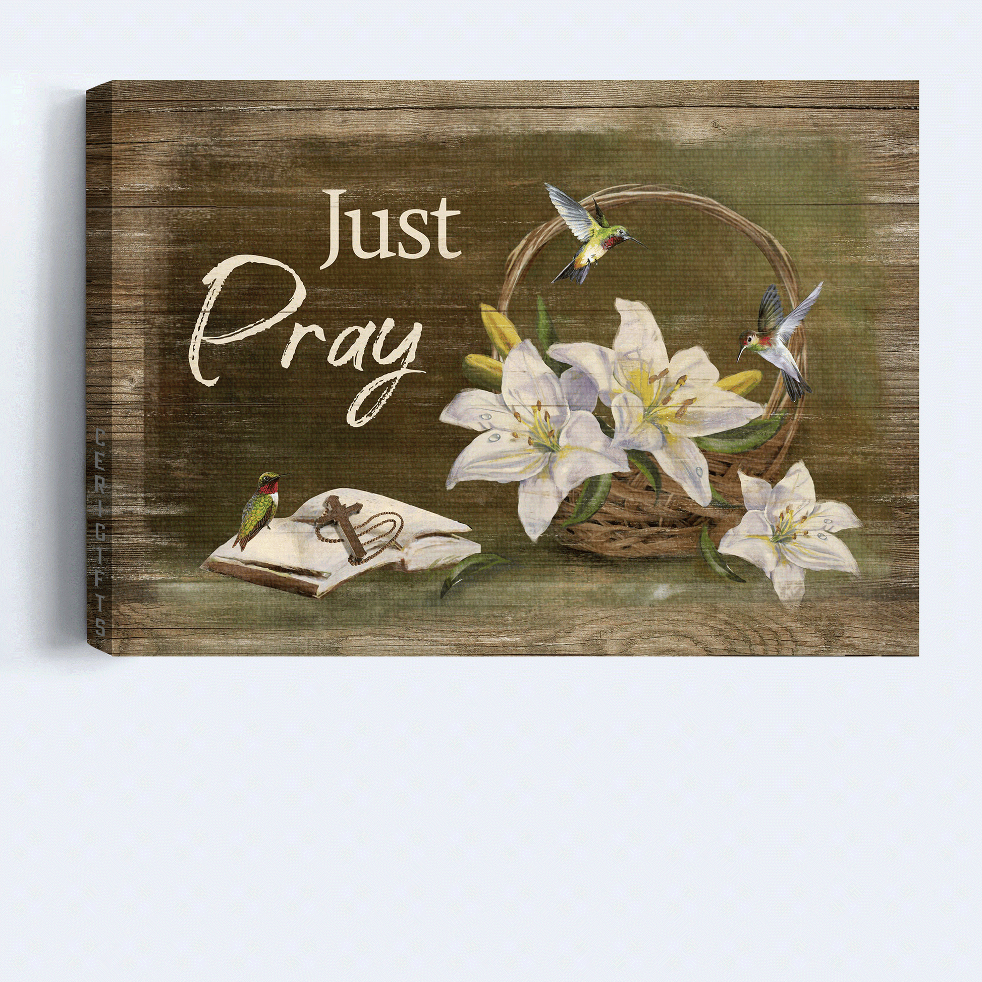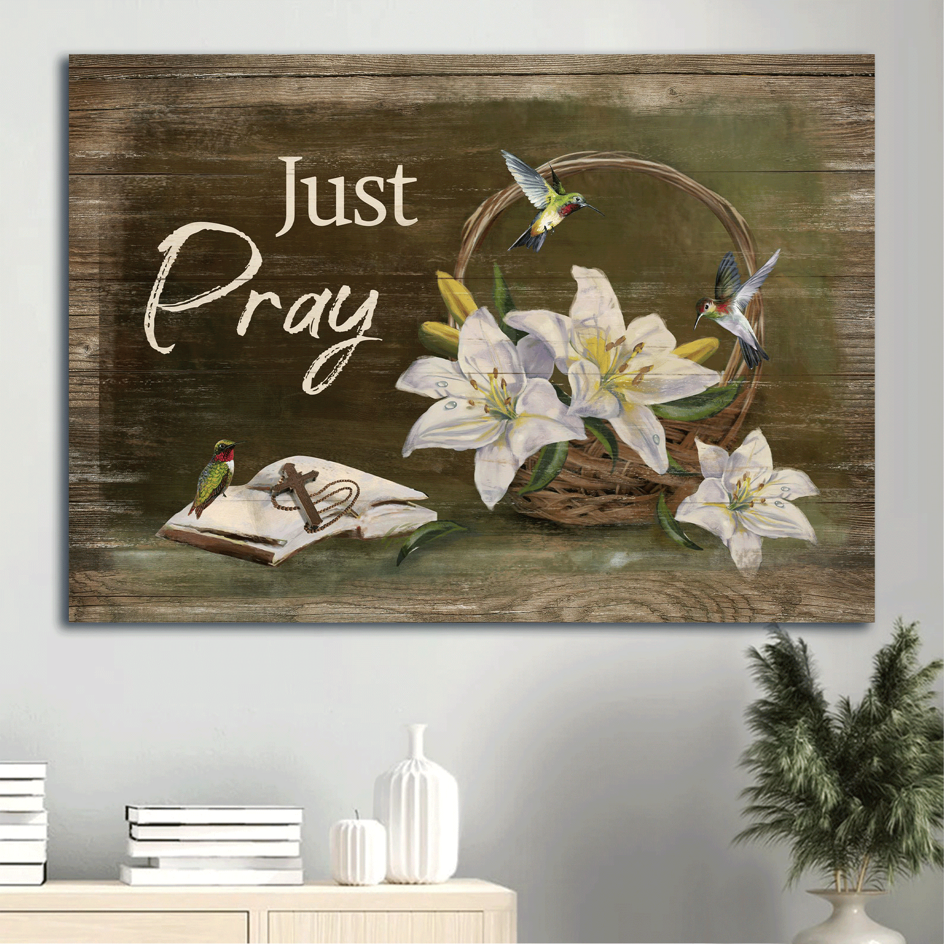 Jesus Landscape Canvas - White Lily Painting, Wooden Cross, Bible, Hummingbirds Canvas - Gift For Christian - Just Pray Canvas