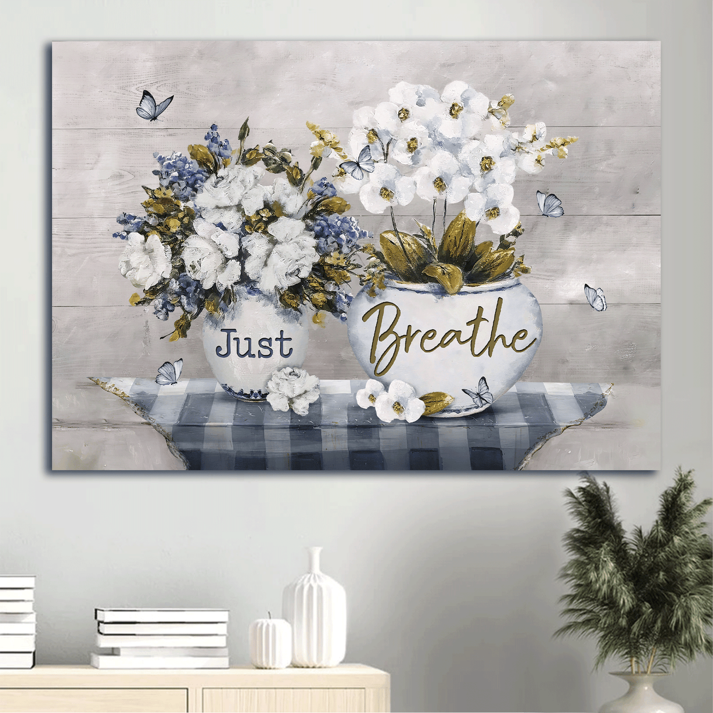 The image of the white orchid with flower painting and meaningful quotes of this amazing Jesus Landscape Canvas - White Orchid, Rose Flower Painting, Blue Butterfly Canvas - Gift For Christian - Just Breathe Canvas Prints, Wall Art will definitely be a meaningful gift not only for your friend but also for your lover and your family. This wonderful canvas will be suitable for any room in your house from the kitchen, bedroom, and living room to outside space.