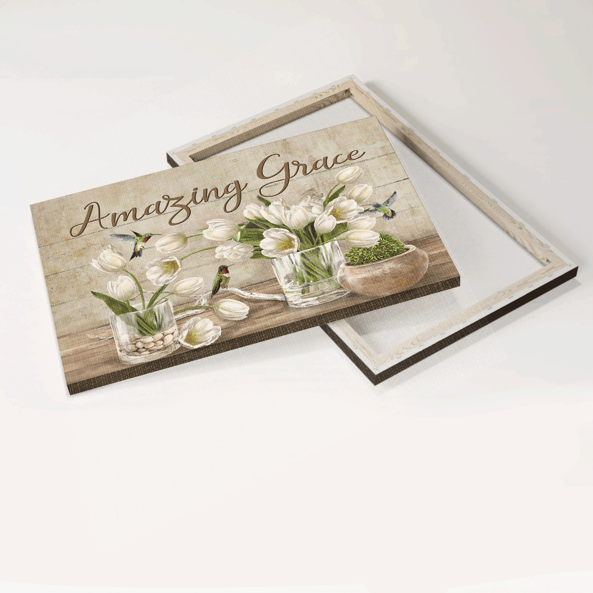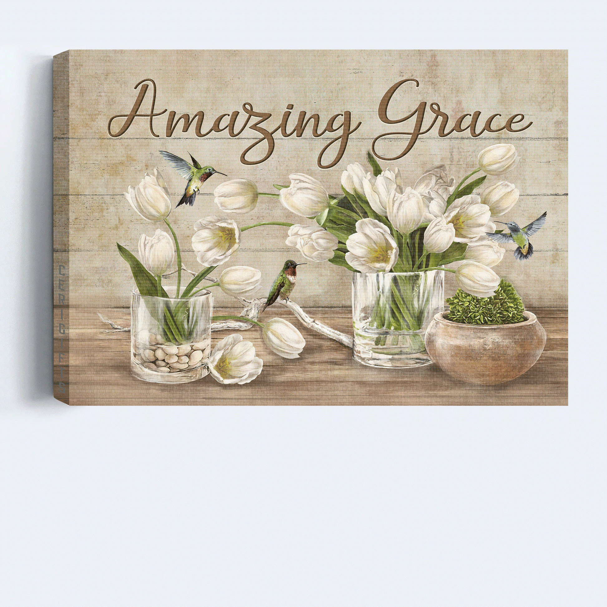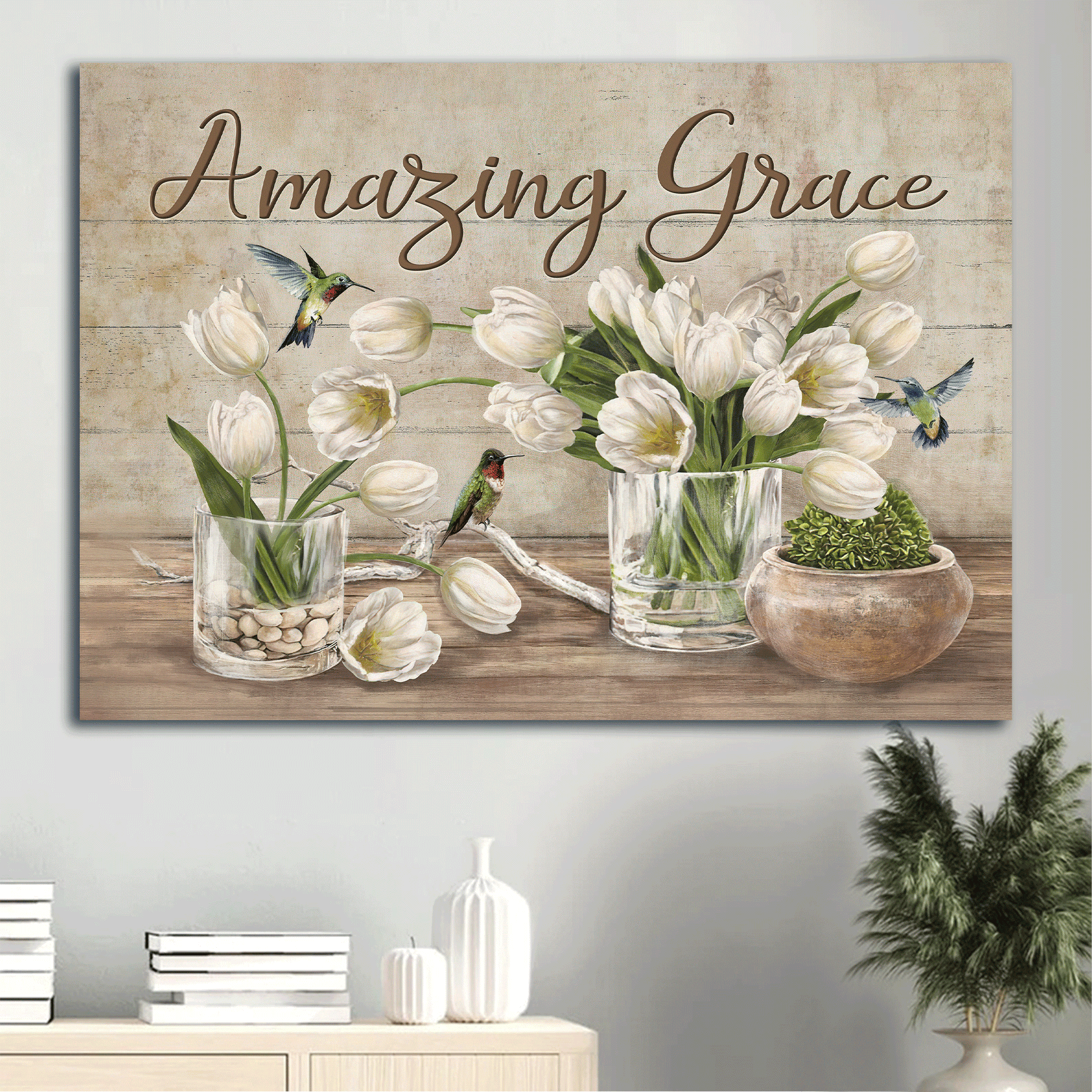 Jesus Landscape Canvas - White Tulip, Still Art Canvas - Gift For Christian - Amazing Grace Canvas Prints, Wall Art has been designed with white tulip and colorful hummingbirds. Opposed to brilliant sunflowers, the tulip is a humble and pure flower, it is also a symbol of perfect and deep love. Therefore, this Jesus Landscape Canvas - White Tulip, Still Art Canvas - Gift For Christian - Amazing Grace Canvas Prints, Wall Art will make your room brighter but elegant, and the word “amazing grace'' will bring a peaceful feeling for you and your whole family.