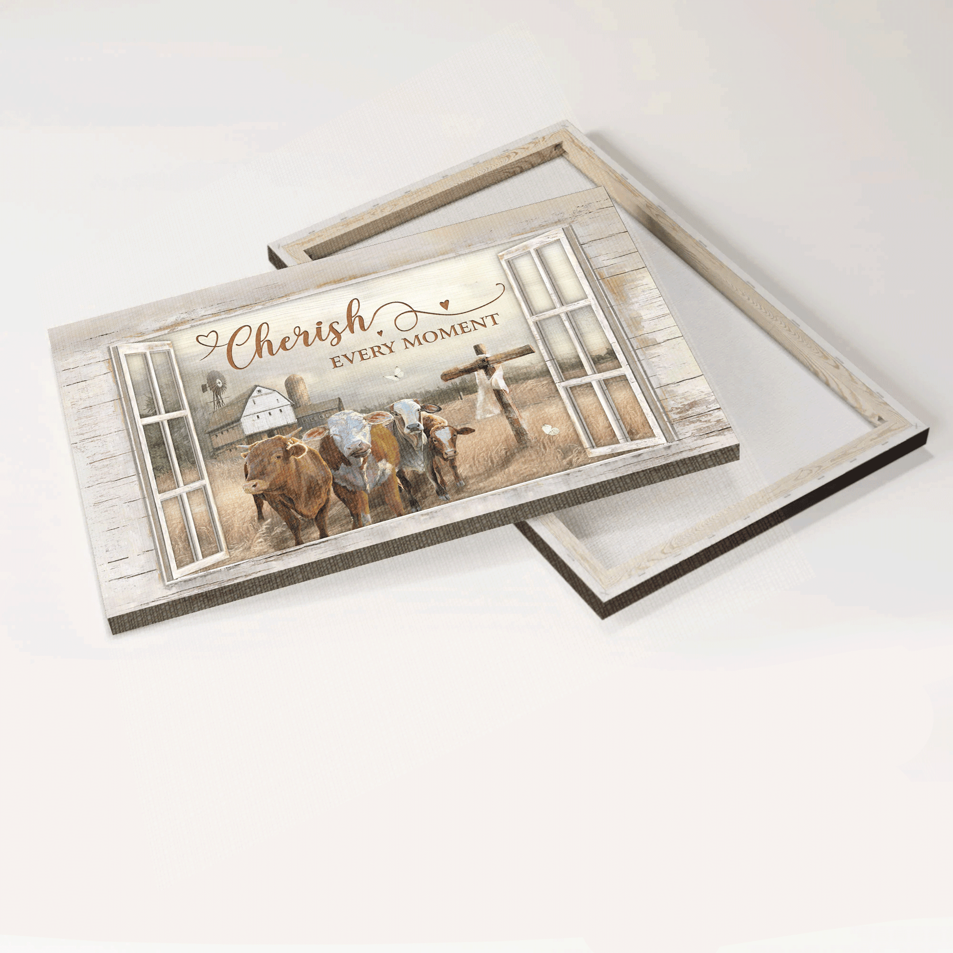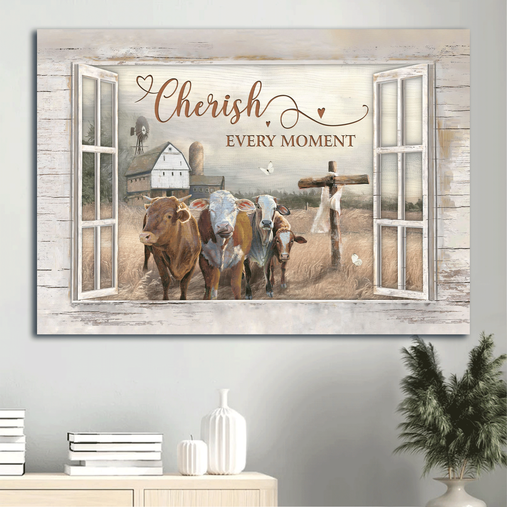 The image of the window frame with cows on the field and meaningful quotes of this amazing Jesus Landscape Canvas - Window Frame, Barn House Painting, Cows On Field Canvas - Gift For Christian - Cherish Every Moment Canvas Prints, Wall Art will definitely be a meaningful gift not only for your friend but also for your lover and your family. This wonderful canvas will be suitable for any room in your house from the kitchen, bedroom, and living room to outside space.