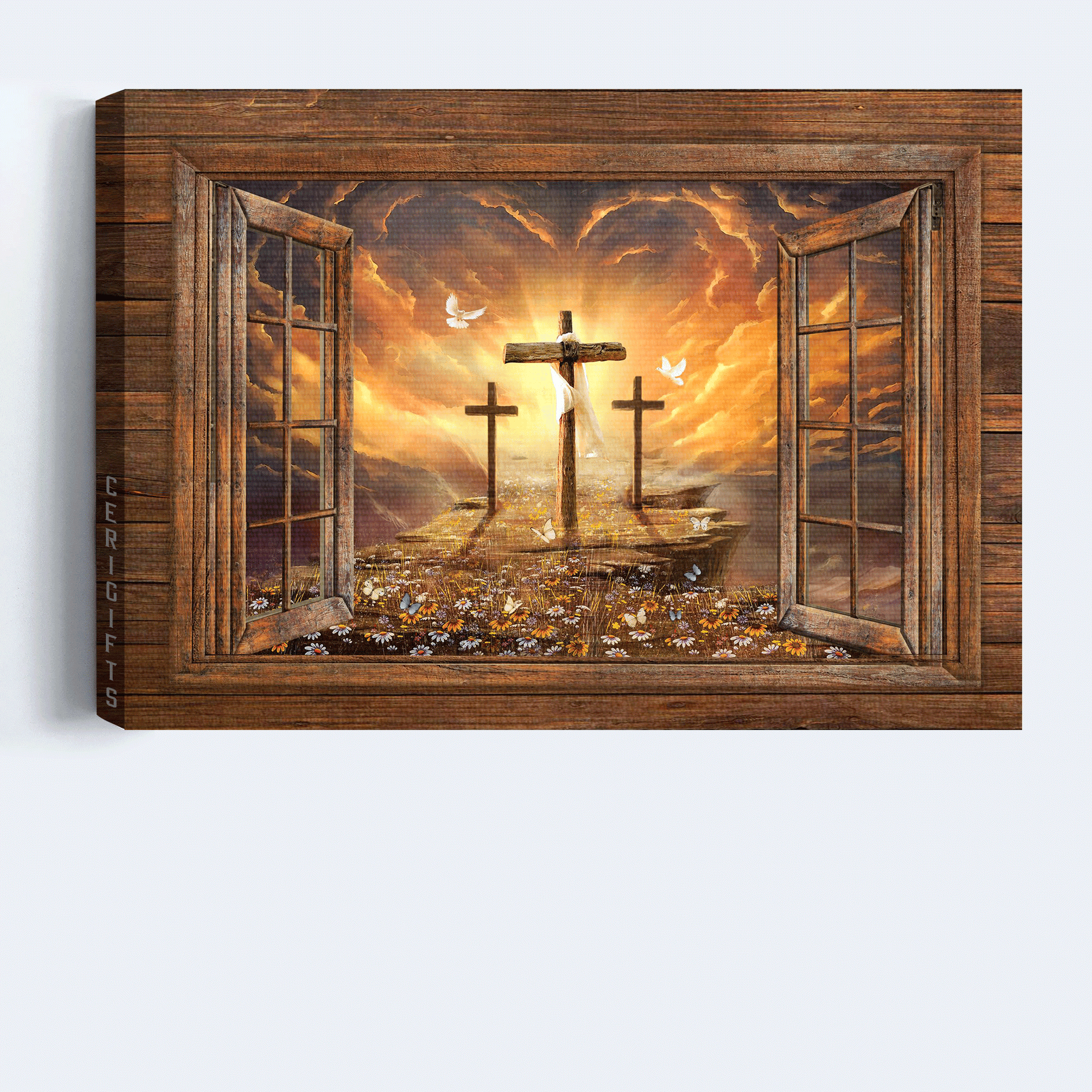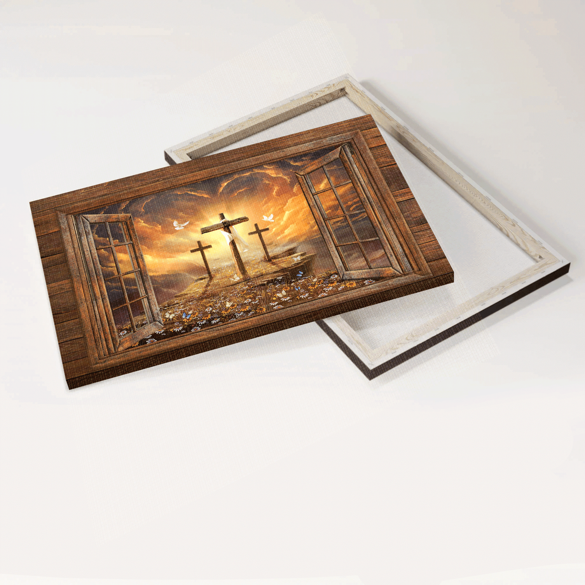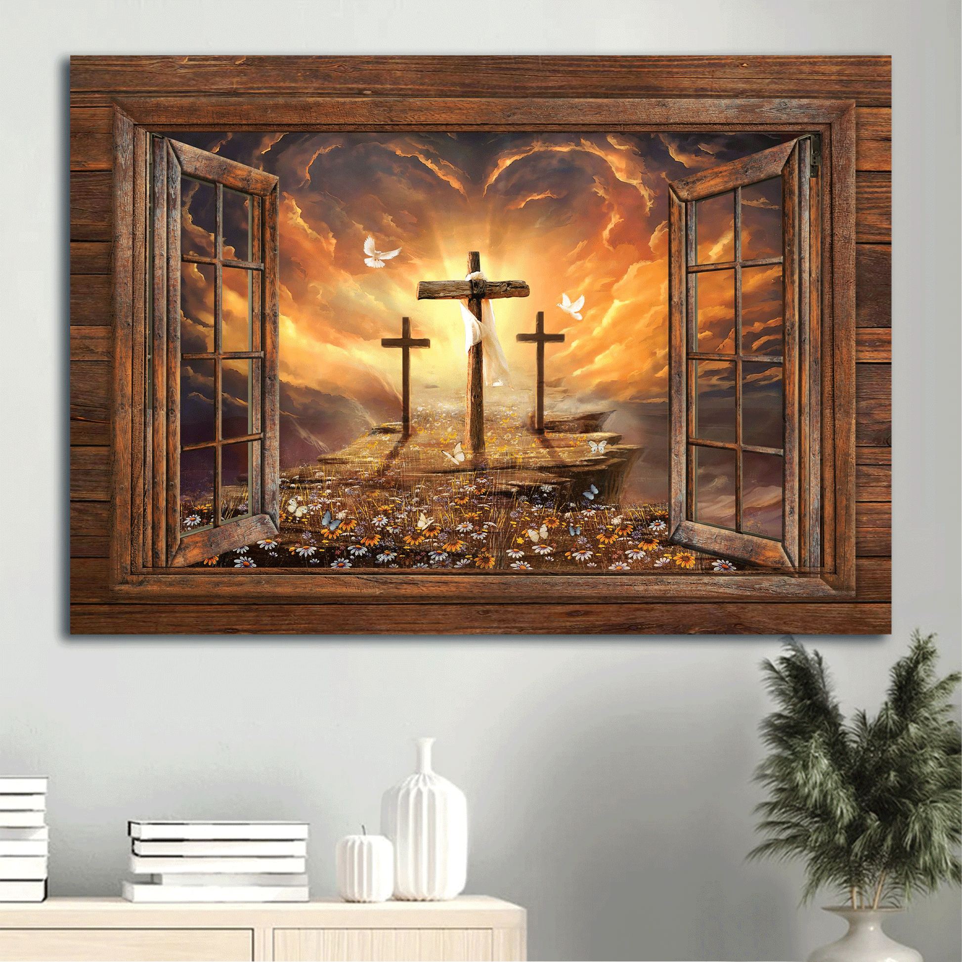 Bring a sense of peace to your house with our Jesus Landscape Canvas - Window Frame, Sunset Painting, Path To Heaven, The Three Crosses Canvas - Gift For Christian Canvas Prints, Wall Art. This painting will purge any dark energy and breathe life into any room with three crosses in a flower field filled with sunflowers and gorgeous light on the horizon. Besides, Jesus Landscape Canvas - Window Frame, Sunset Painting, Path To Heaven, The Three Crosses Canvas - Gift For Christian Canvas Prints, Wall Art is also a great gift for your religious friends.