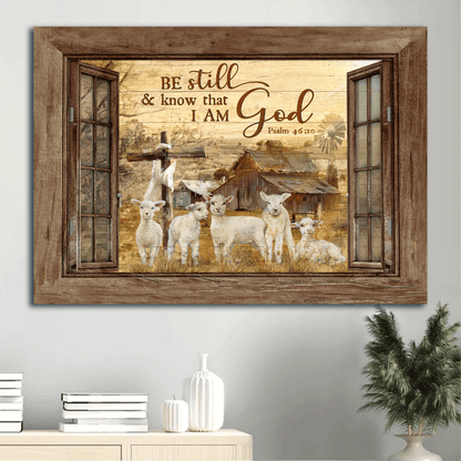 Jesus Landscape Canvas - Window Frame, The Lambs Of God, Old Barn Painting Canvas - Gift For Christian - Be Still & Know That I Am God Canvas