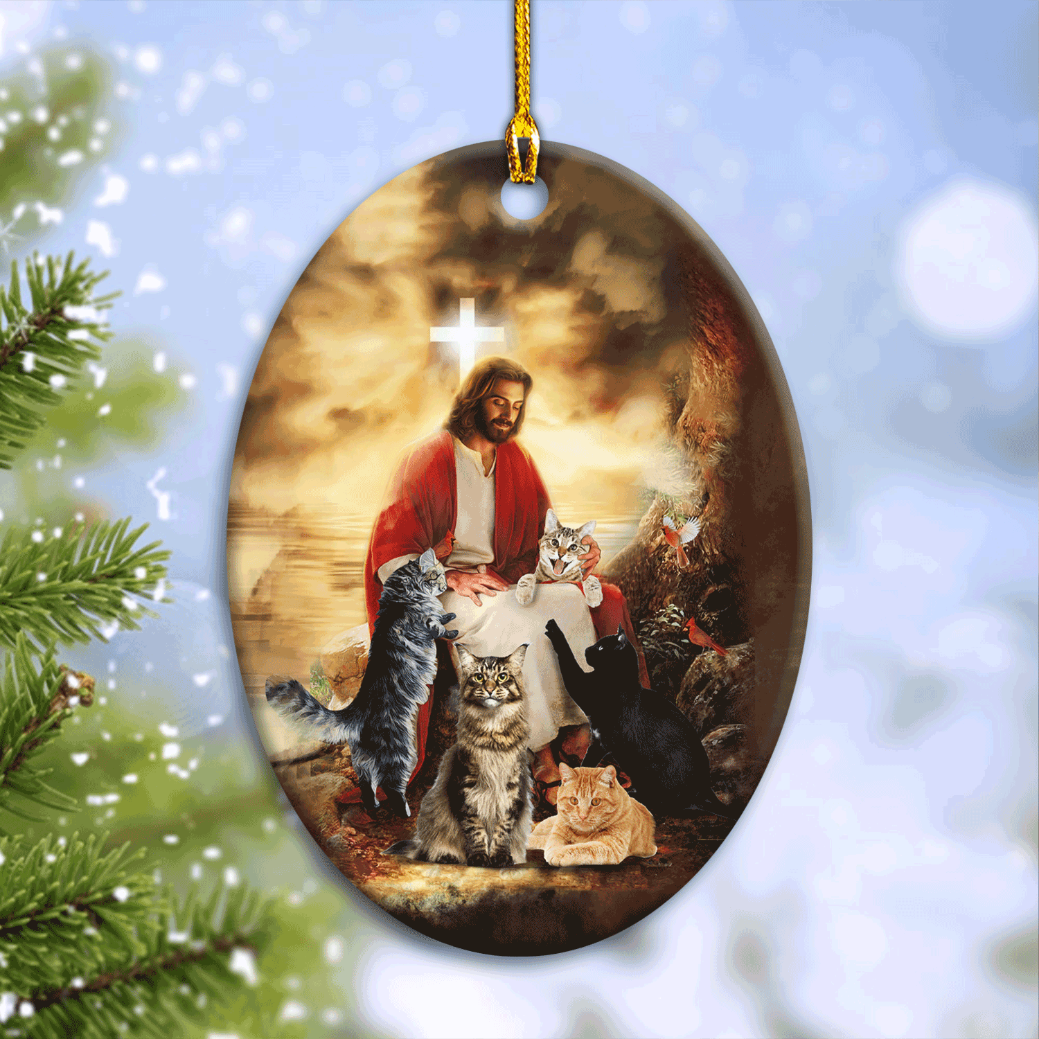 God always treats all beings with fairness and kindness, even if they are small and weak creatures like cats. He welcomes all innocent beings with open arms and then he protects them. With bright colors, adorable cats and Jesus, our Jesus Oval Ceramic Ornament - Cats Painting, Sitting With Jesus - Christian Gift embodies the heart and soul of Jesus that will become your spiritual medicine.