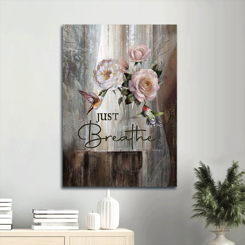 Jesus Portrait Canvas- Abstract Art, Hummingbird Drawing, Rose Painting, White Peony Portrait Canvas- Gift For Religious Christian- Just Breathe