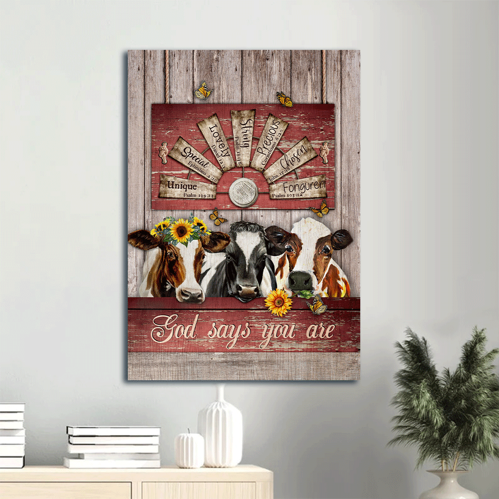 May your day be full of joy with this Jesus Portrait Canvas- Amazing Dairy Cow, Sunflower Wreath, Windmill Portrait Canvas- Gift For Christian- God Says You Are.