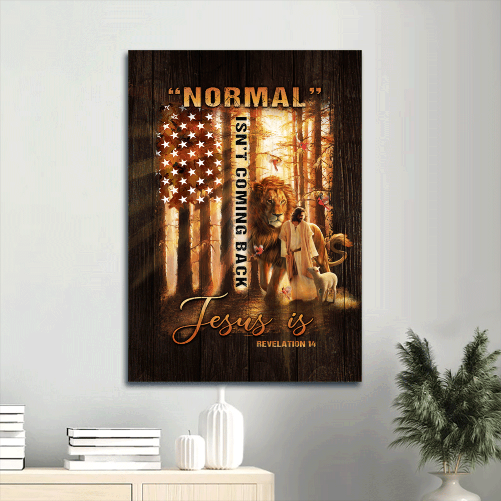 Make your home becomes more perfect with our Jesus Portrait Canvas- Amazing Forest, Lion Painting, Animal Of God, Jesus Portrait Canvas- Gift For Christian- Normal Isn't Coming Back Jesus Is . It depicts an incredible image of Jesus with the Lion of Judah and the Lamb of God during his reign in the amazing forest. Jesus Christ is a perfect combination of the lion’s braveness, the lamb's purity and God’s benevolence. Furthermore, the color scheme makes it a versatile piece in nearly any style of home. Our Jesus Portrait Canvas- Amazing Forest, Lion Painting, Animal Of God, Jesus Portrait Canvas- Gift For Christian- Normal Isn't Coming Back Jesus Is is also perfect for those who believe in Jesus. Let’s show your passion to visitors with this unique wall art which is hung on your wall.