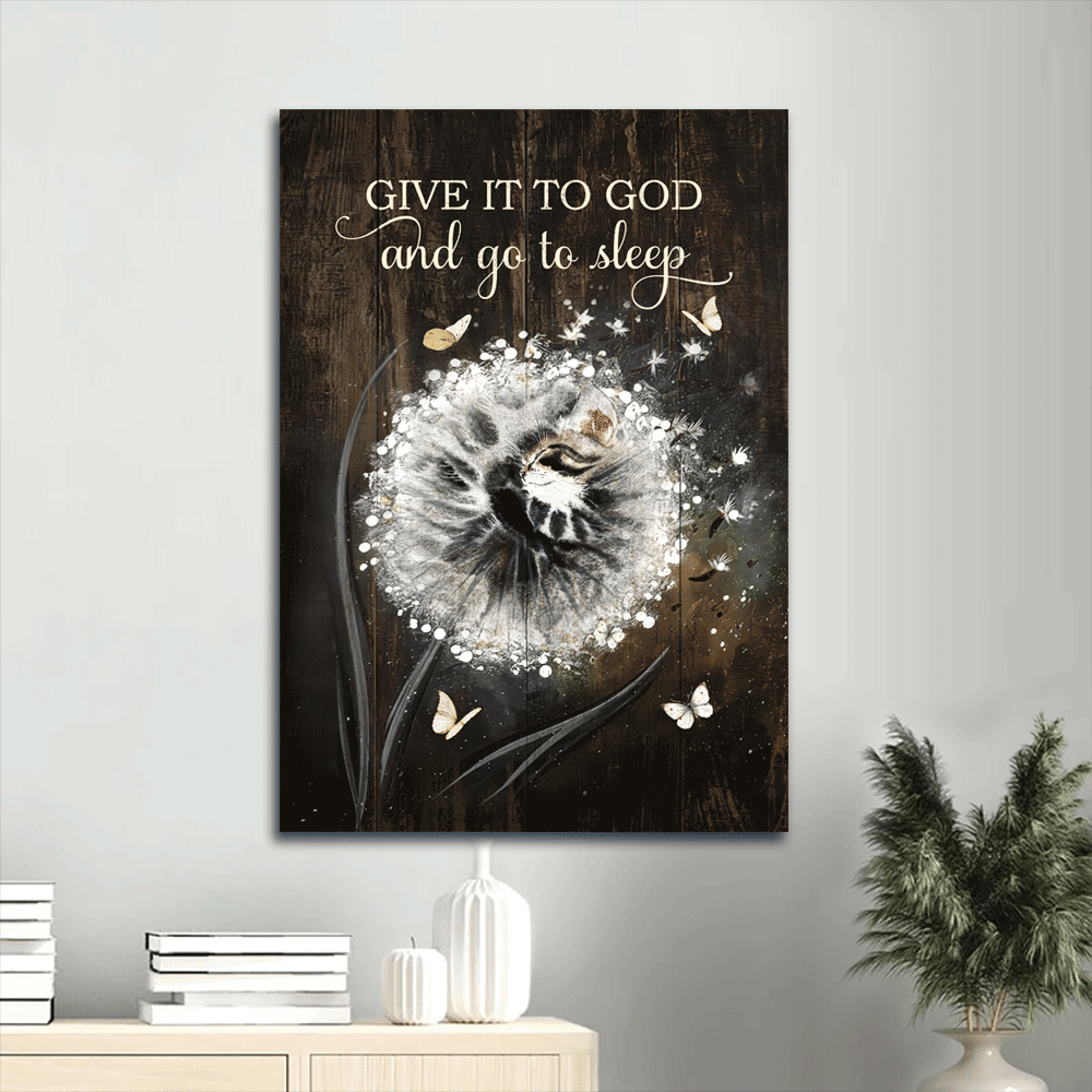 Jesus Portrait Canvas- Beautiful Dandelion, White Butterfly, Lovely Cat Canvas- Gift For Christian- Give It To God And Go To Sleep.