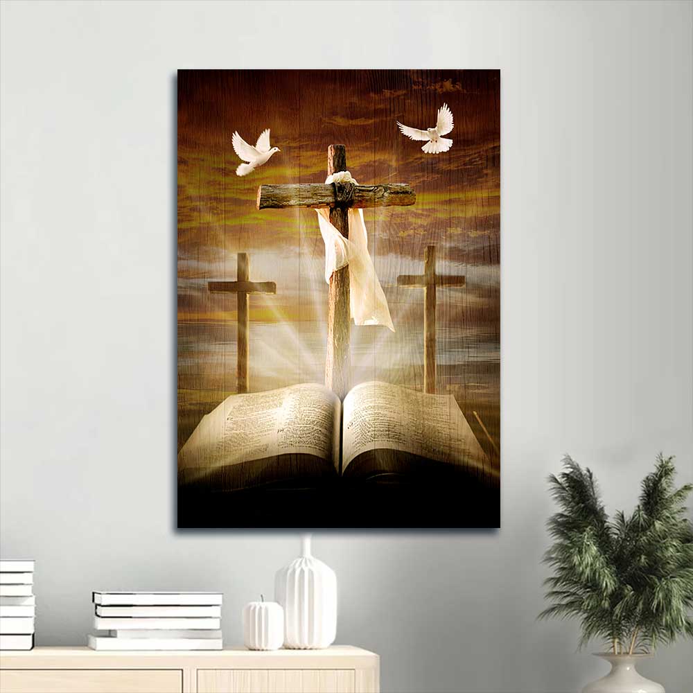 Across our canvas, it depicts an image of a Bible book and the three rugged crosses surrounded by white doves with amazing halo background that will bring a sense of peace to your soul. Its fantastic color scheme makes it a versatile piece in nearly any style of home. Our Big cross, Amazing halo, Bible painting, White dove symbol - Jesus Portrait Canvas Prints, Christian Wall Art is wonderful artwork that will suit any room from the living room, bedroom, kitchen to the entryway in your house or your office, building, hotel, restaurant and even the coffee shop,...