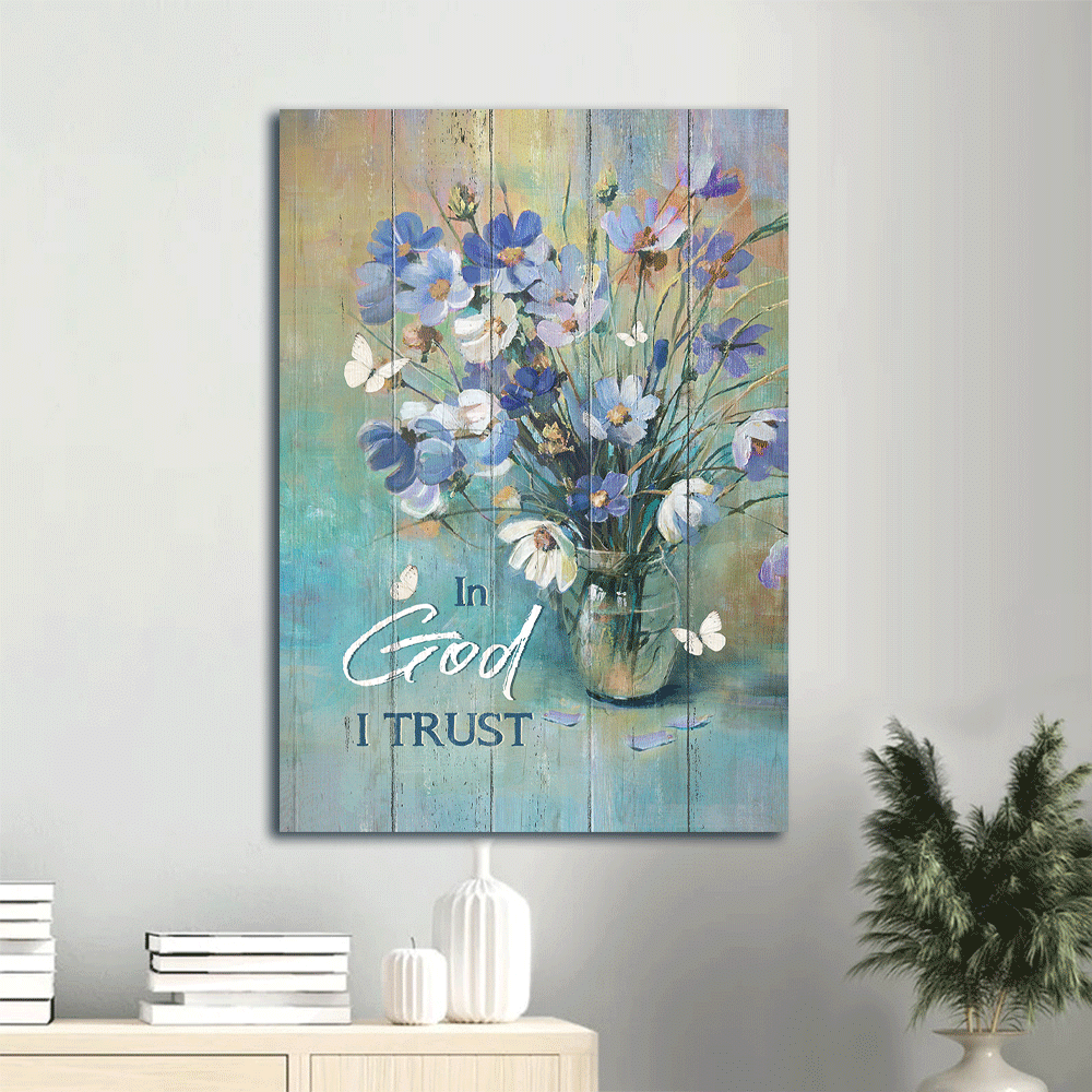 With blue-tone color, gorgeous delicate flowers, lovely white butterflies, still life paintings, and meaningful quotes, this Jesus Portrait Canvas- Blue delicate flower, White butterfly, Still life painting canvas- Gift for Christian- In God I trust - Portrait Canvas Prints, Christian Wall Art will become a significant feature in your house. This amazing canvas is an ideal gift not only for your friend but also for your lover and especially your family.