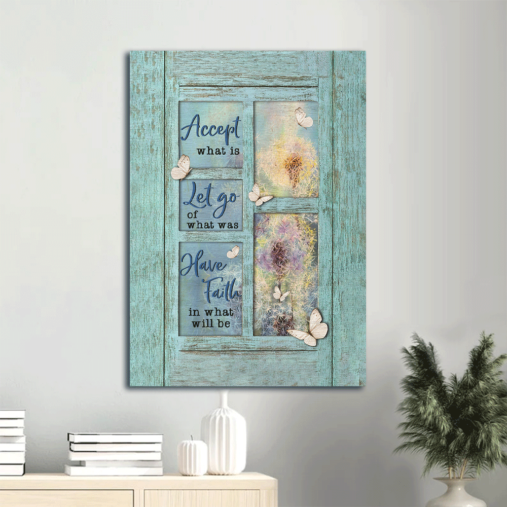 Jesus Portrait Canvas- Blue Window, Pretty Dandelion, Beautiful Butterfly canvas- Gift for Christian- Accept What Is Let Go - Portrait Canvas, Wall Art is a marvelous canvas that can be hung in any room in your house.