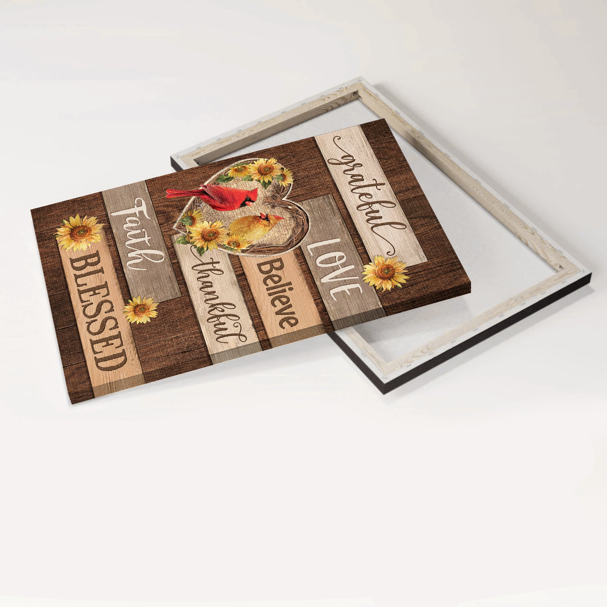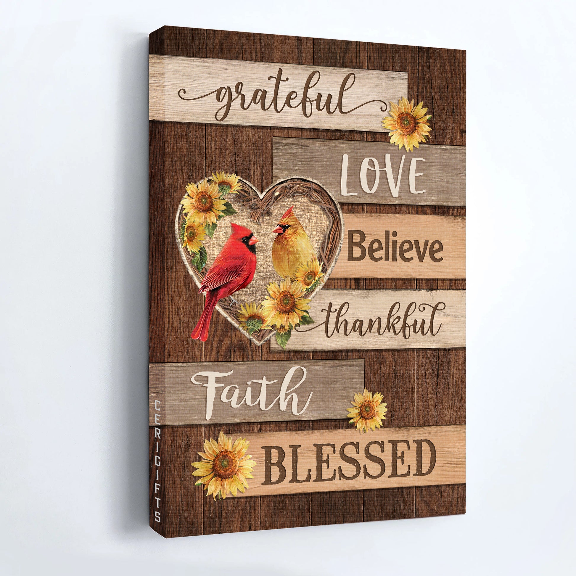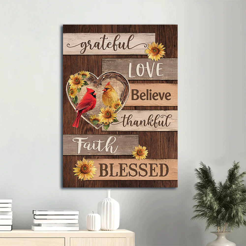 The lovely cardinal couple in the heart shape with lovely sunflowers and meaningful quote of this Cardinal couple, Heart shape, Sunflower drawing, Grateful, Love, Believe - Jesus Portrait Canvas Prints, Christian Wall Art will bring refresh air to your house. It is also an ideal gift for anyone such as your friend, your lover and your family, especially for one who loves flowers.