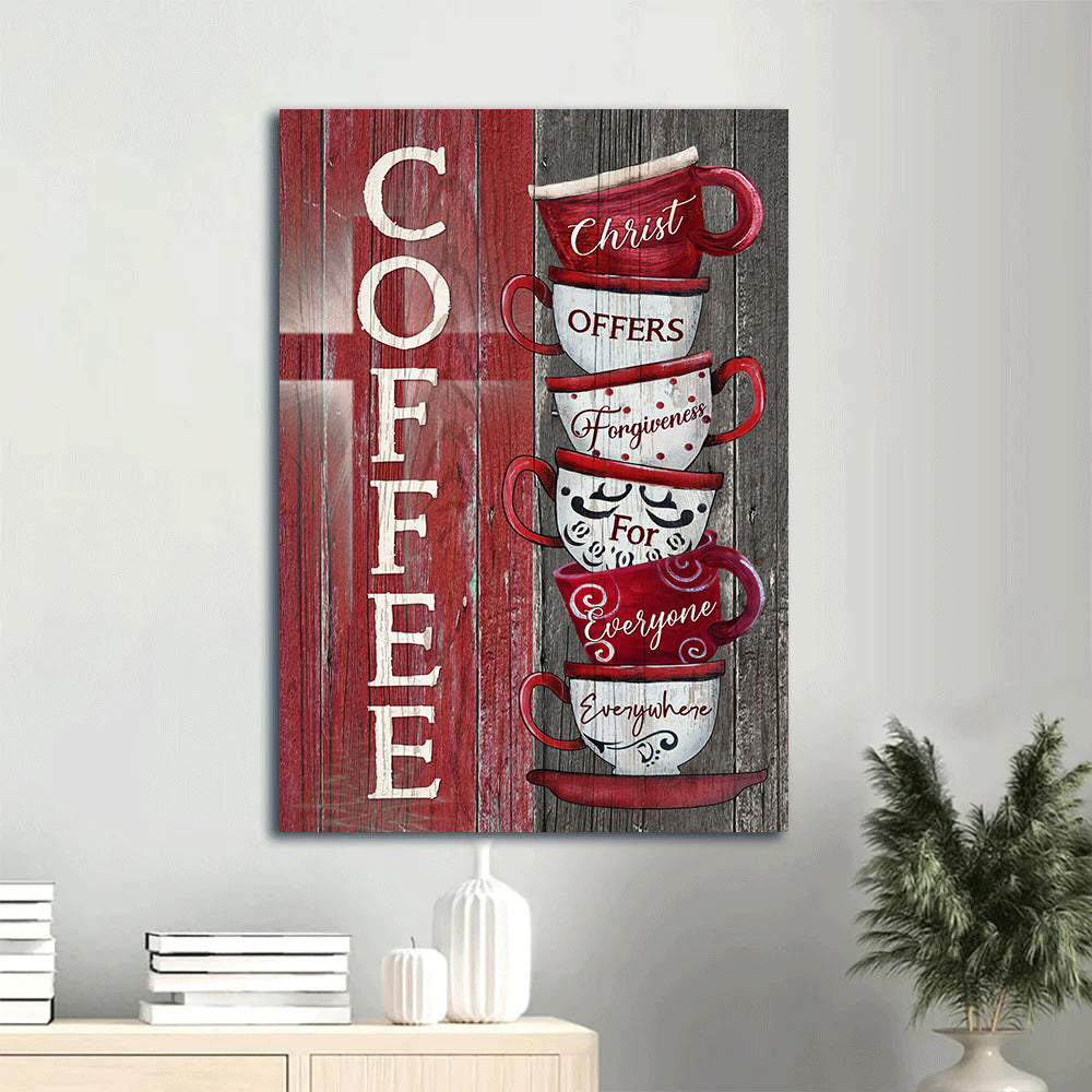 Coffee Cups, Stacked Cups, Red And White Coffee Cups, Wooden Cross, Christ Offers Forgiveness For Everyone Everywhere- Jesus Portrait Canvas, Wall Decor Visual Art can be hung on the wall of your kitchen, living room, bedroom, bathroom, and even outdoor space.