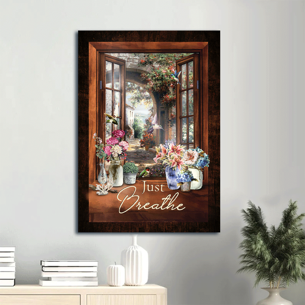 Jesus Portrait Canvas- Flower garden, Beautiful scene, Sunlight, Hummingbird canvas- Gift for Christian- Just breathe- Portrait Canvas Prints, Christian Wall Art