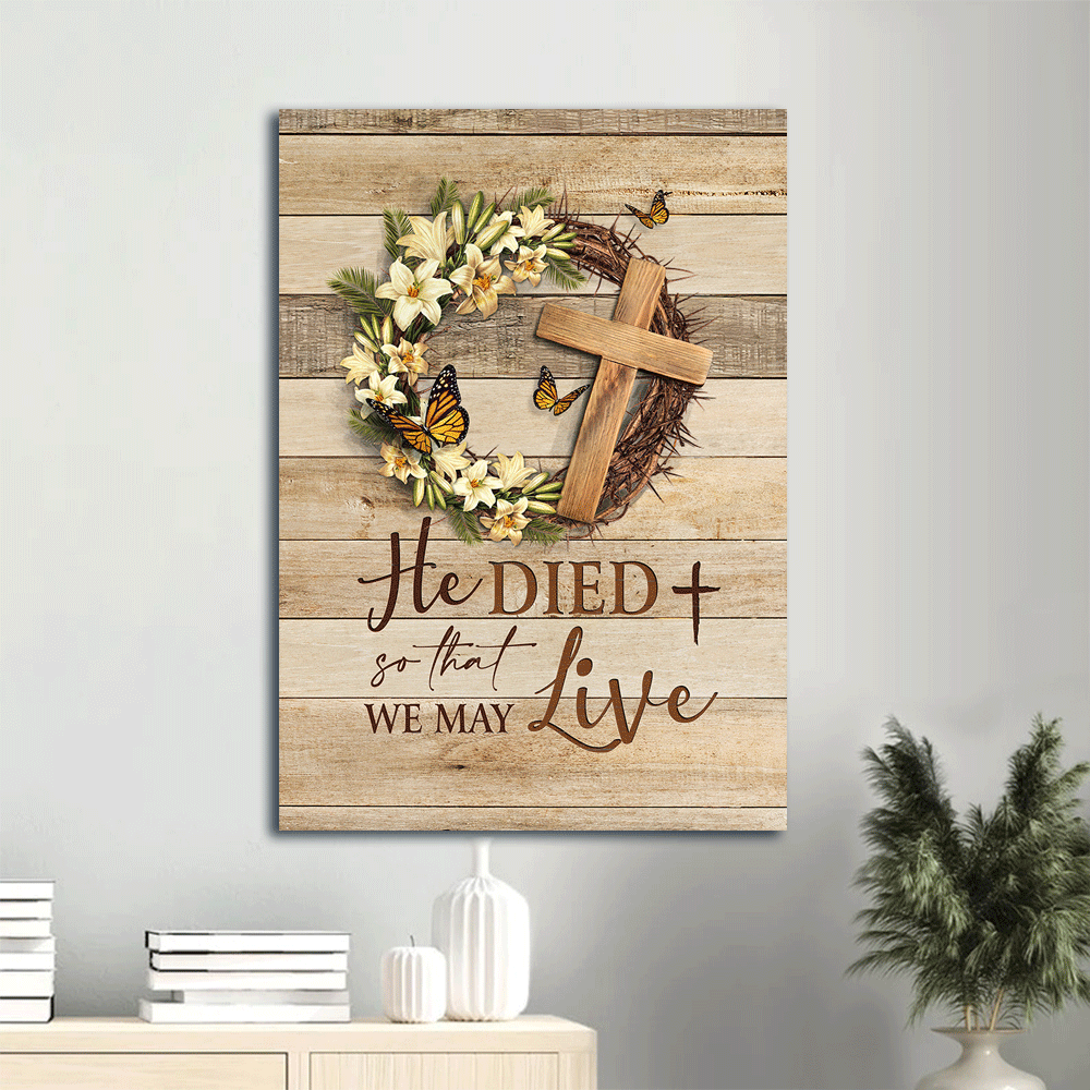 Jesus Portrait Canvas- Gorgeous lily, Wooden cross, Lovely monarch butterfl- Gift for Christian- He died so that we may live - Jesus Portrait Canvas Prints, Christian Wall Art is a wonderful picture which can be hung in any room in your house such as living room, bedroom, kitchen or even outdoor space.