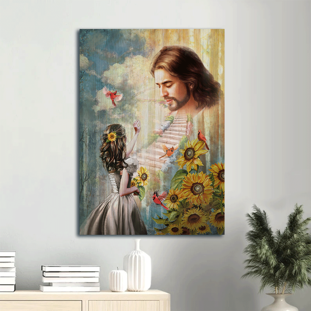 Jesus Portrait Canvas- Jesus painting, Awesome red cardinal, Lovely sunflower, Girl and path to heaven- Gift for Christian - Portrait Canvas Prints, Christian Wall Art